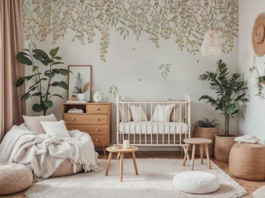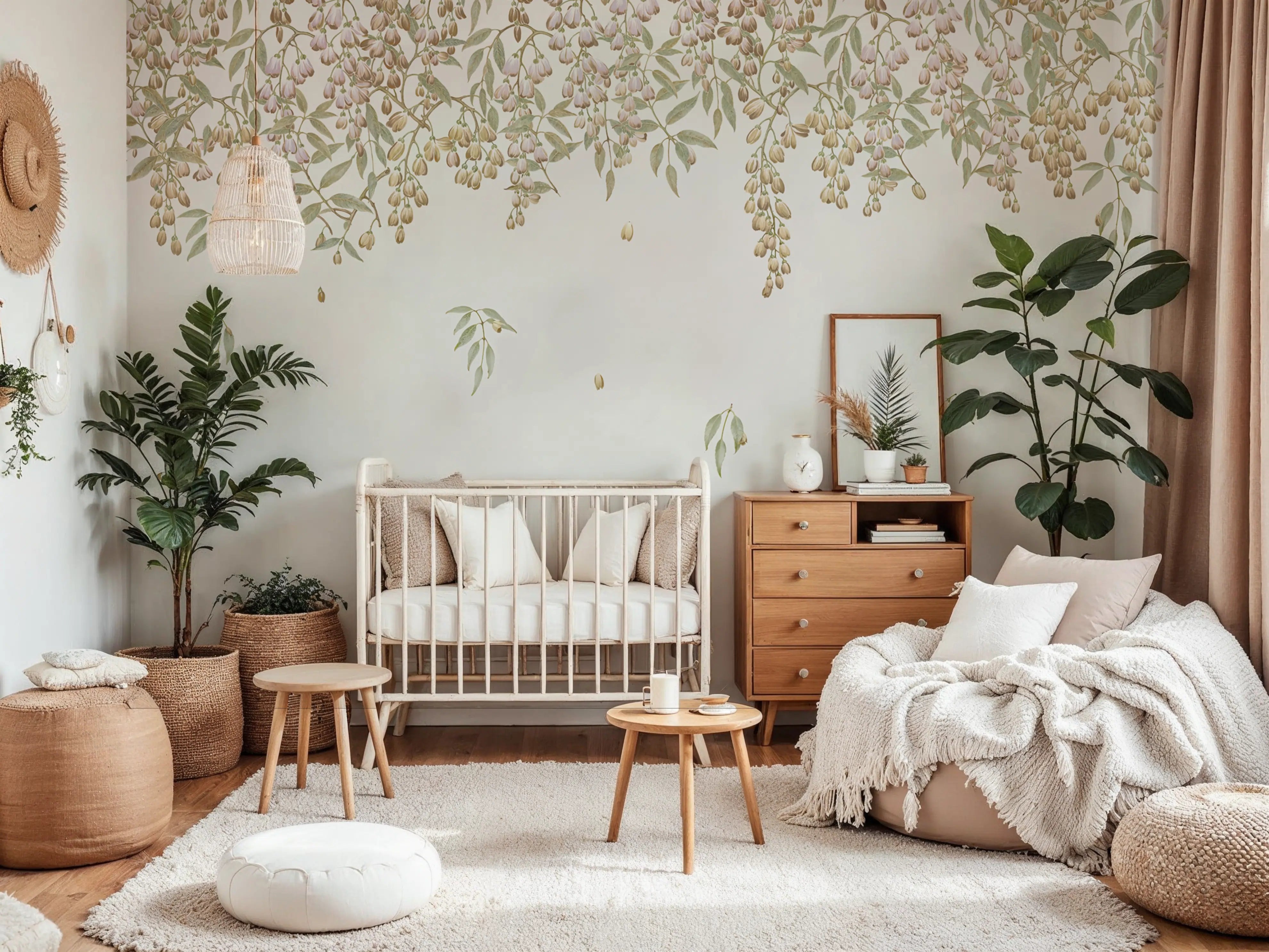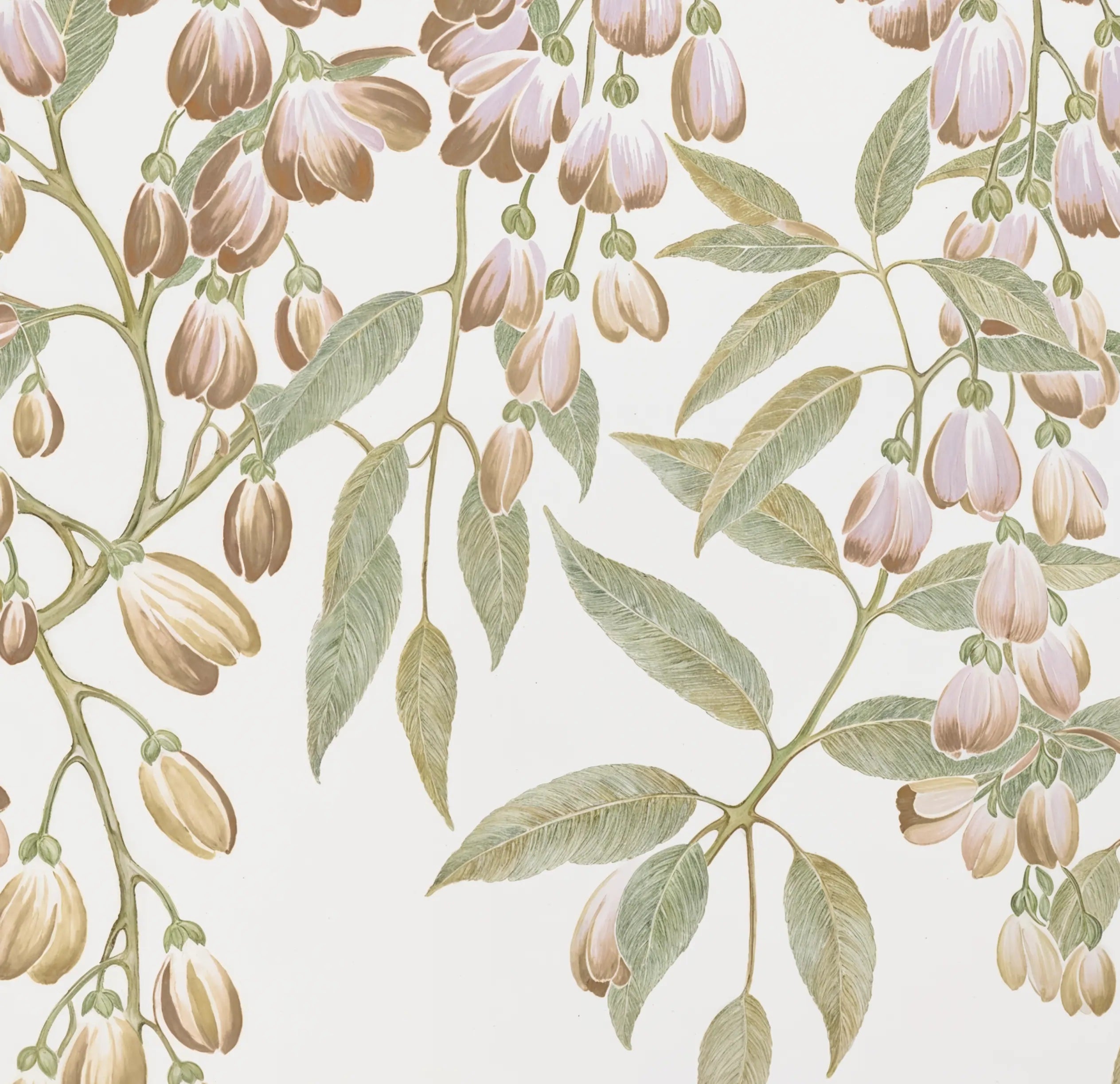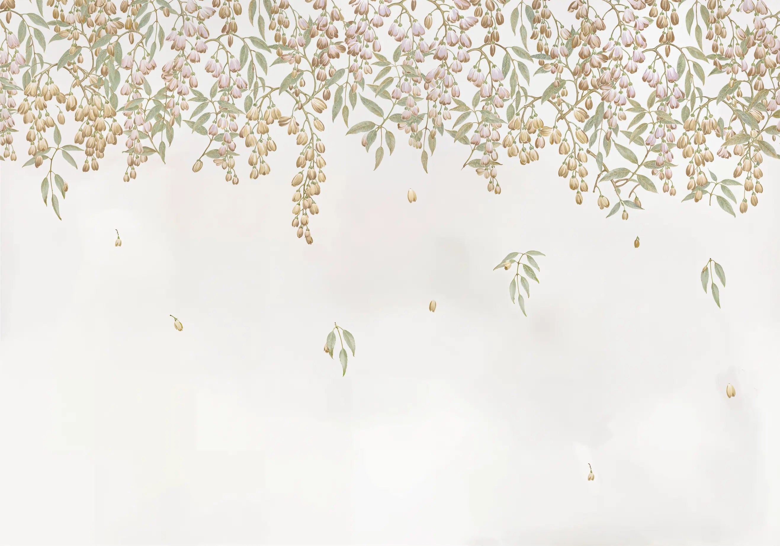 Mural floral cascata neutra ADcorista sob medida. Decoração suave e elegante com flores pendentes em tons de bege, creme e verde claro. Crie um ambiente calmo e atemporal em qualquer espaço!