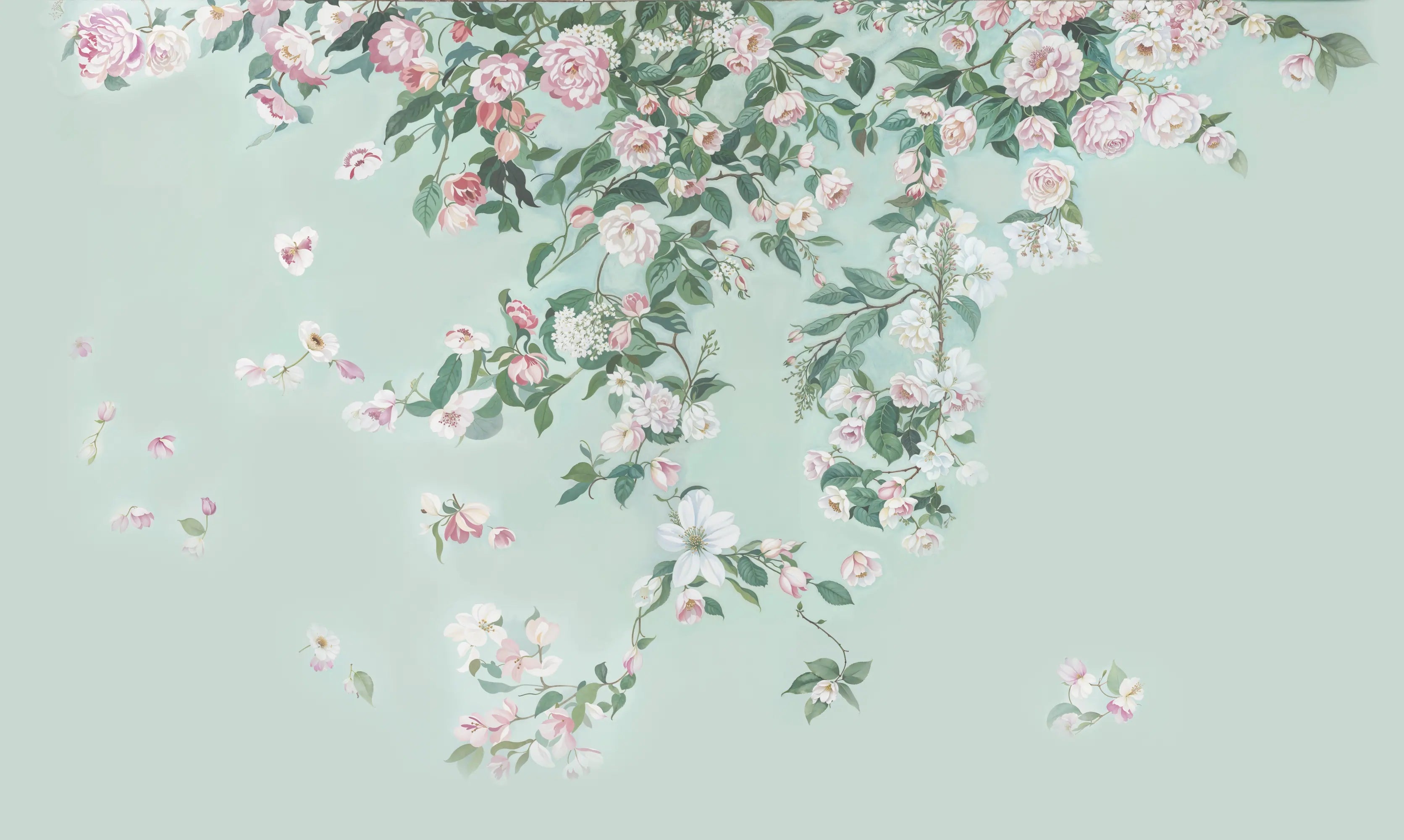 Papel de Parede Foral em Cascata ADcorista com rosas e flores delicadas em tons pastel de rosa e branco, com folhagem suave sobre um fundo sereno. Decoração romântica e elegante para diversos ambientes.