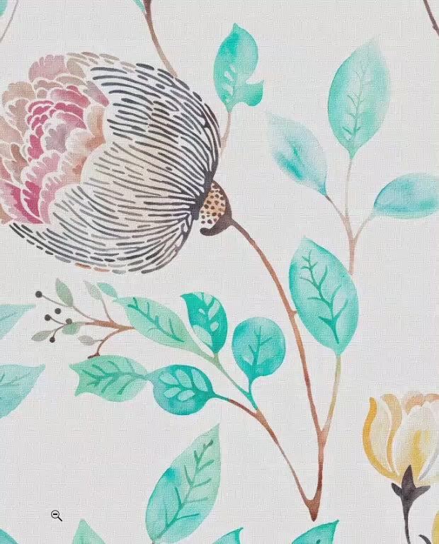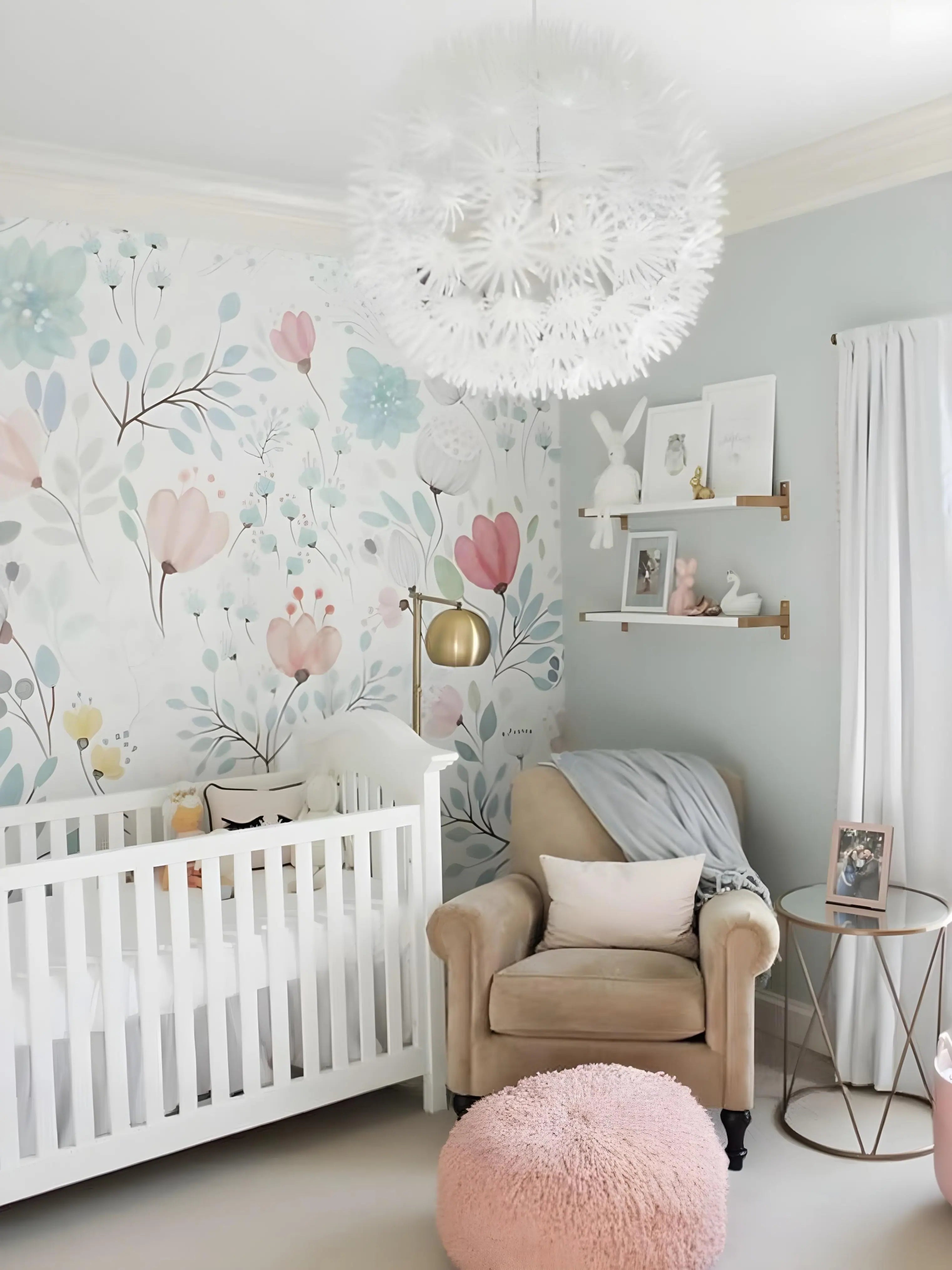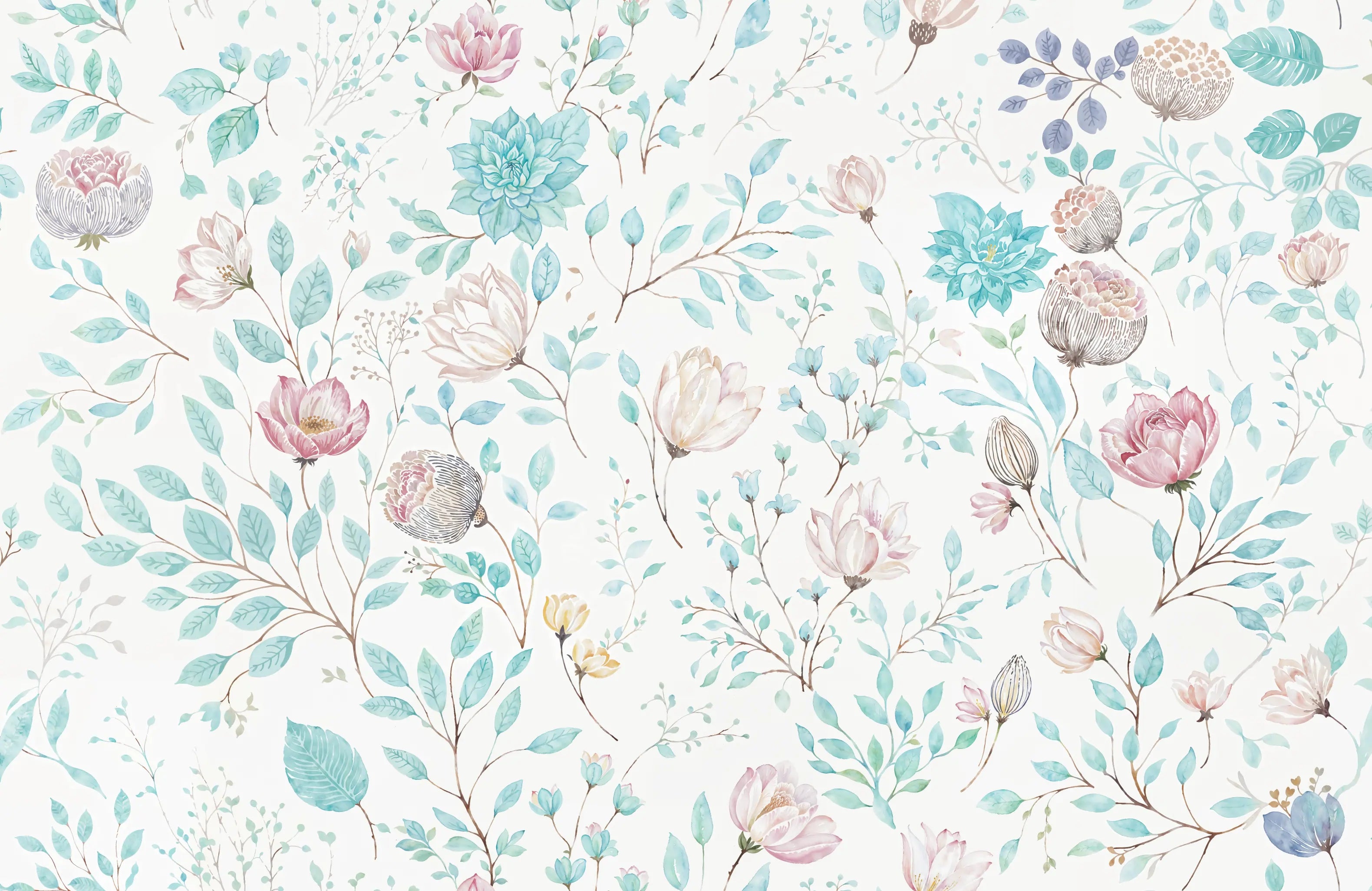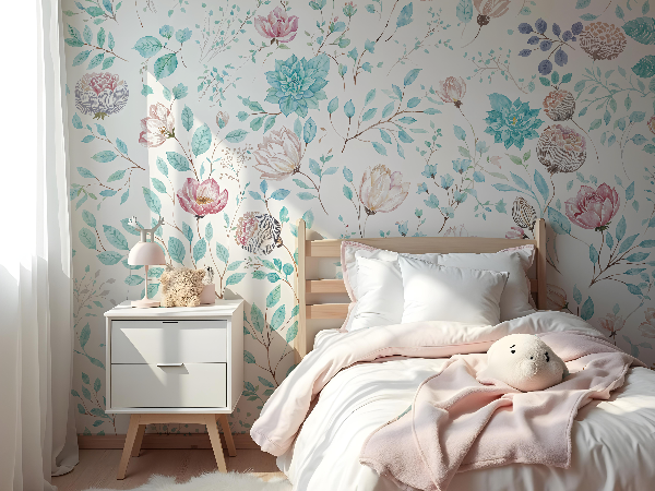 Mural floral aquarelado ADcorista com flores grandes em tons pastel de rosa, azul, verde e toques de amarelo, mantendo um estilo delicado. Decoração suave e com impacto visual, ideal para quarto de menina.