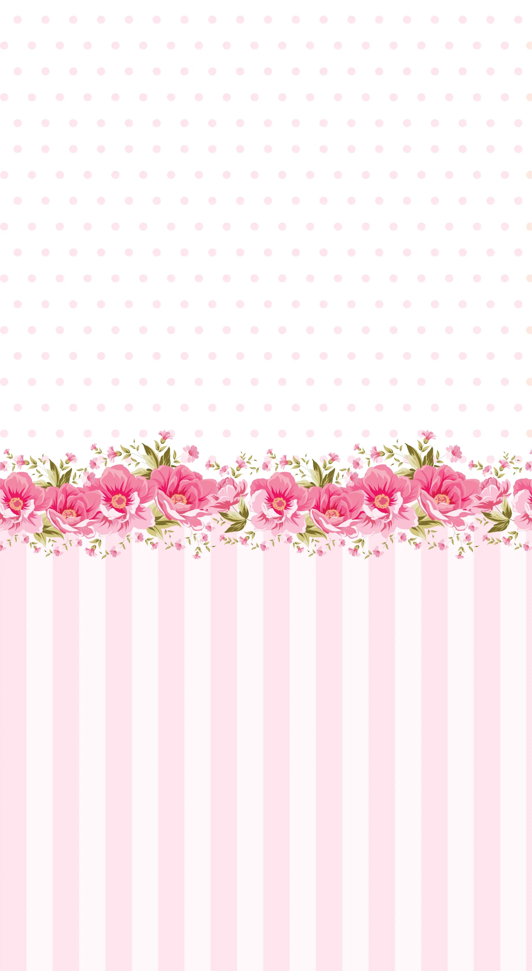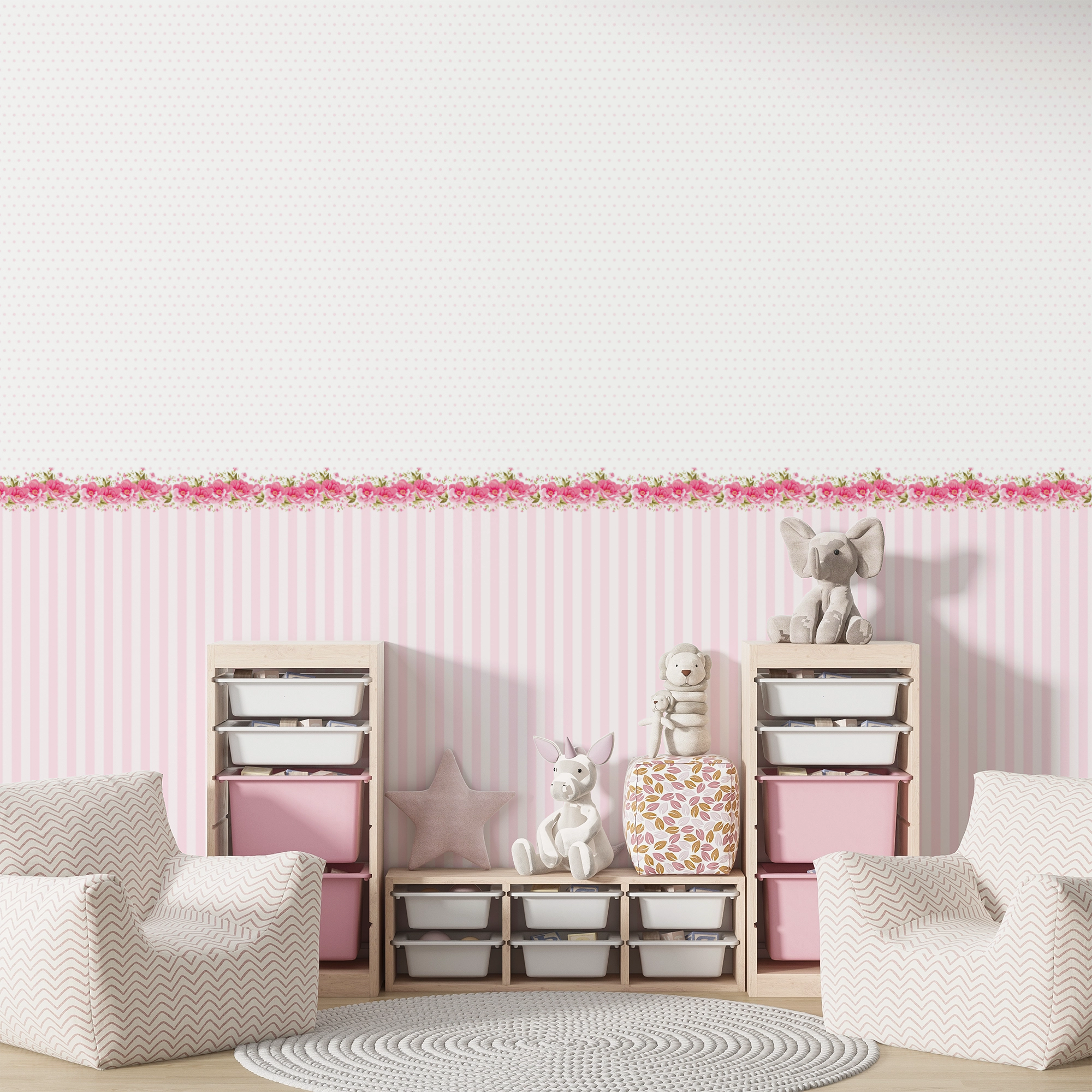 Mural floral rosa vibrante ADcorista com faixa central de flores, fundo poá delicado e listras rosa e brancas na base. Decoração charmosa e alegre para diversos ambientes.