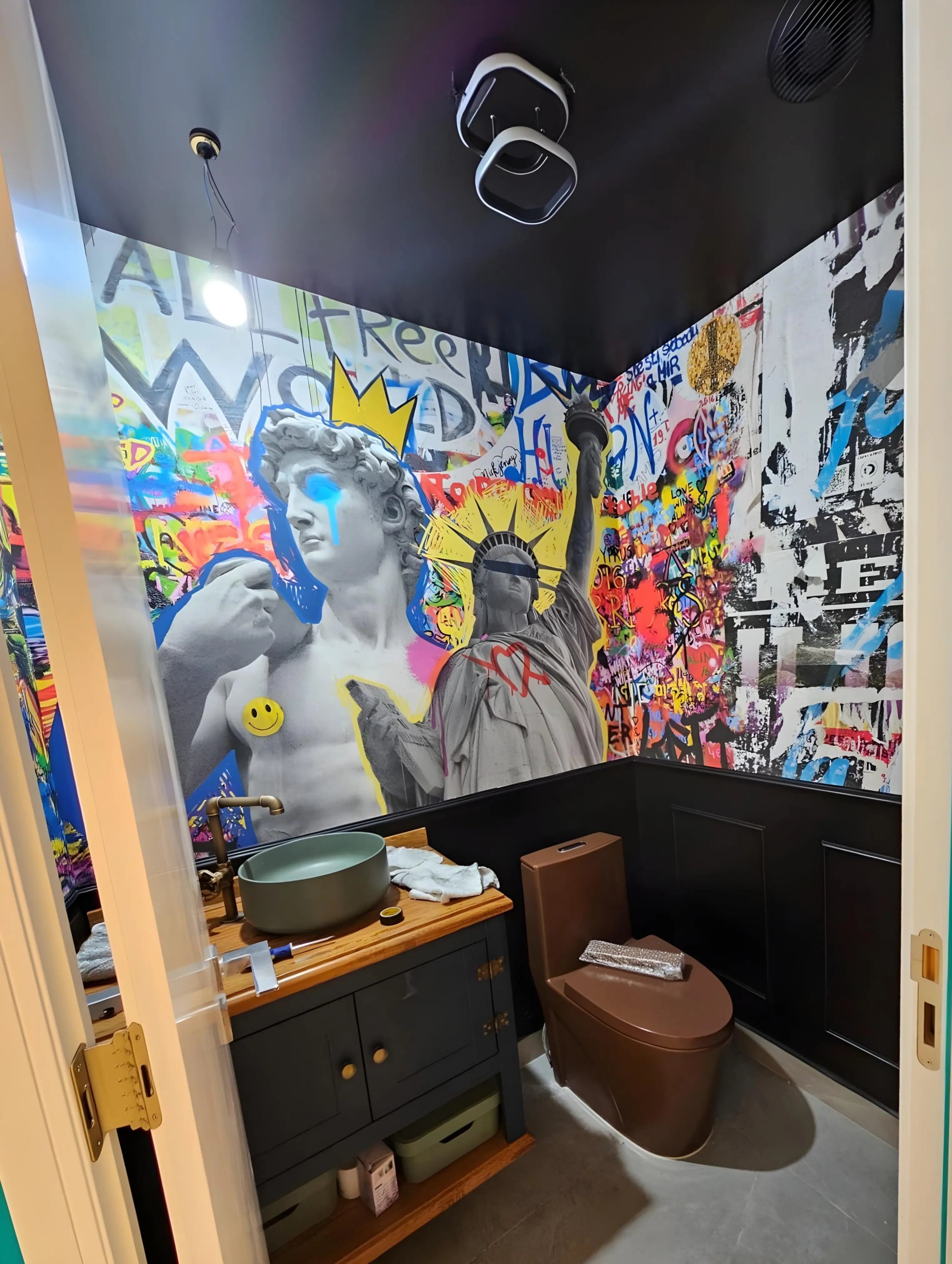 Mural ADcorista com colagem urbana vibrante de Davi e Estátua da Liberdade em grafite colorido. Arte moderna e ousada para um ambiente cheio de atitude.