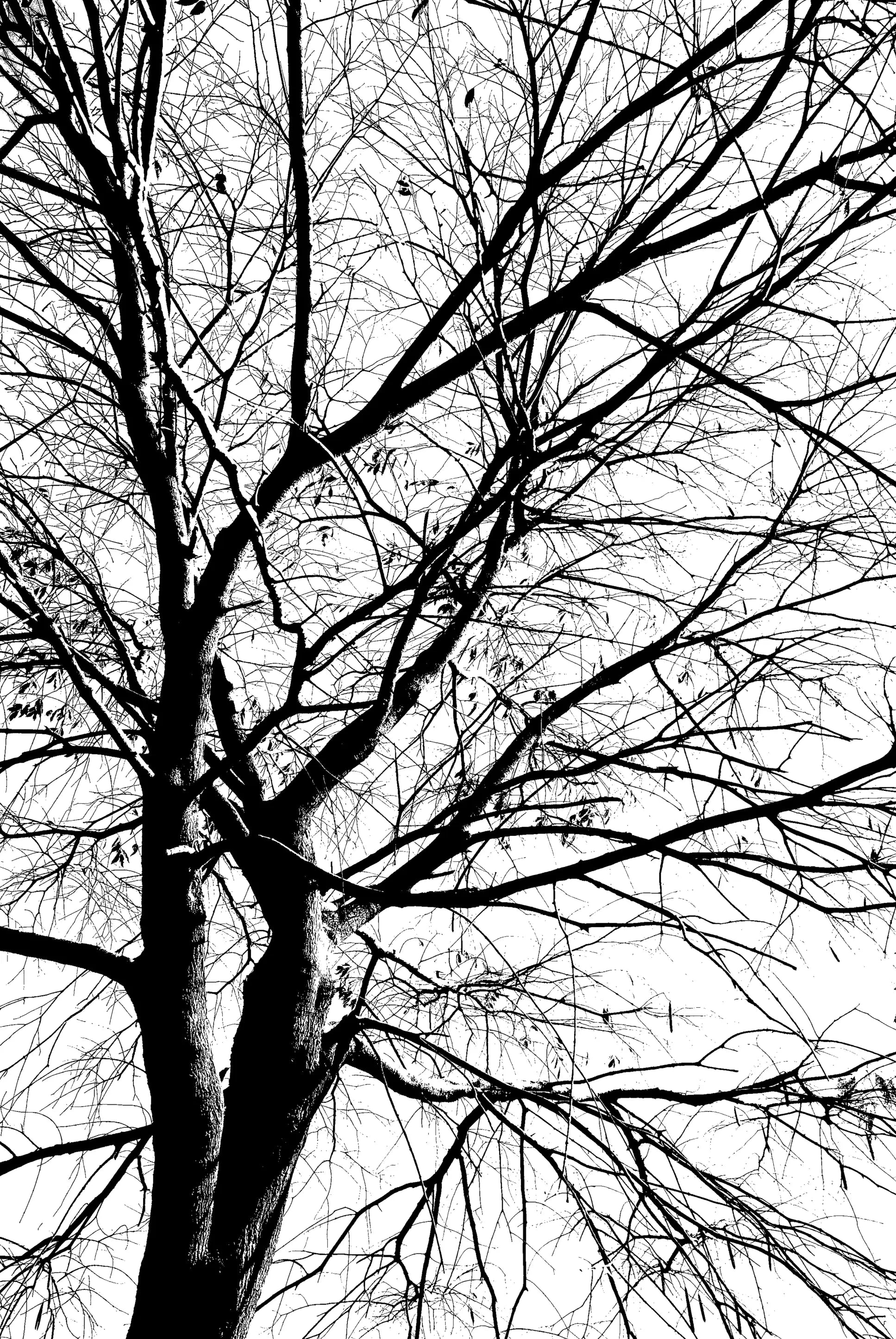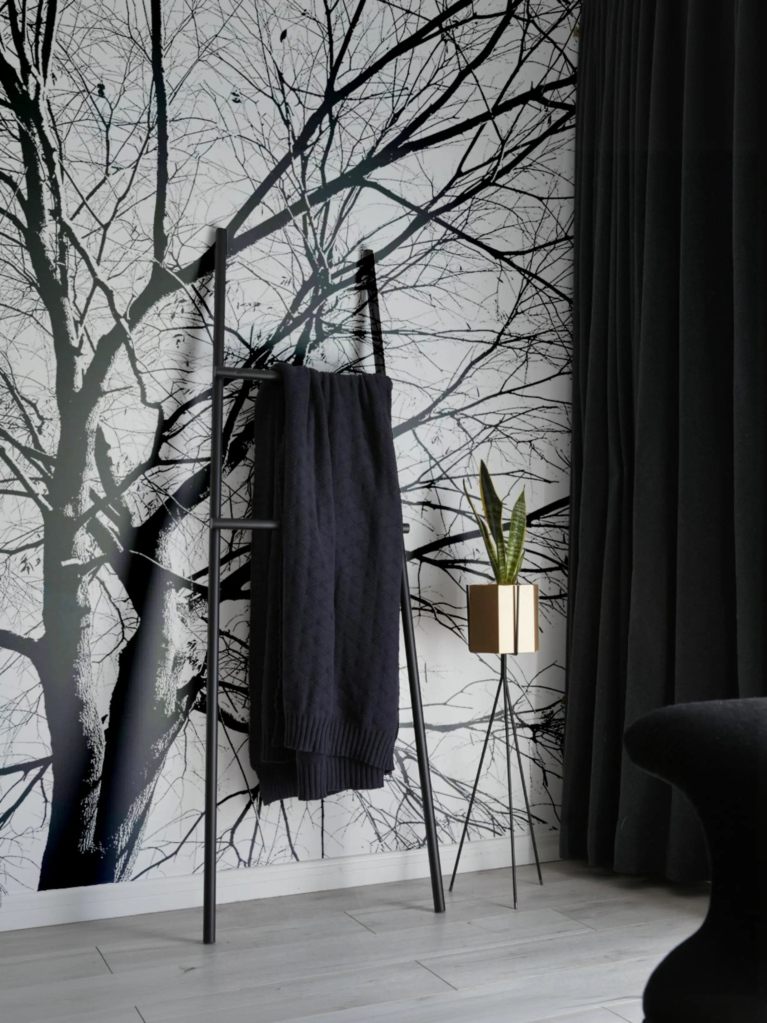 Papel de parede ADcorista com uma silhueta dramática de árvore com galhos secos em preto sobre um fundo branco. Design minimalista e artístico para um toque natural e moderno.