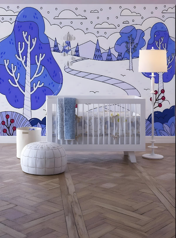 Surpreenda-se com este mural que transforma árvores em tons de azul vibrantes, criando um visual fantástico e cativante. Os detalhes realistas da floresta adicionam profundidade e beleza ao design.