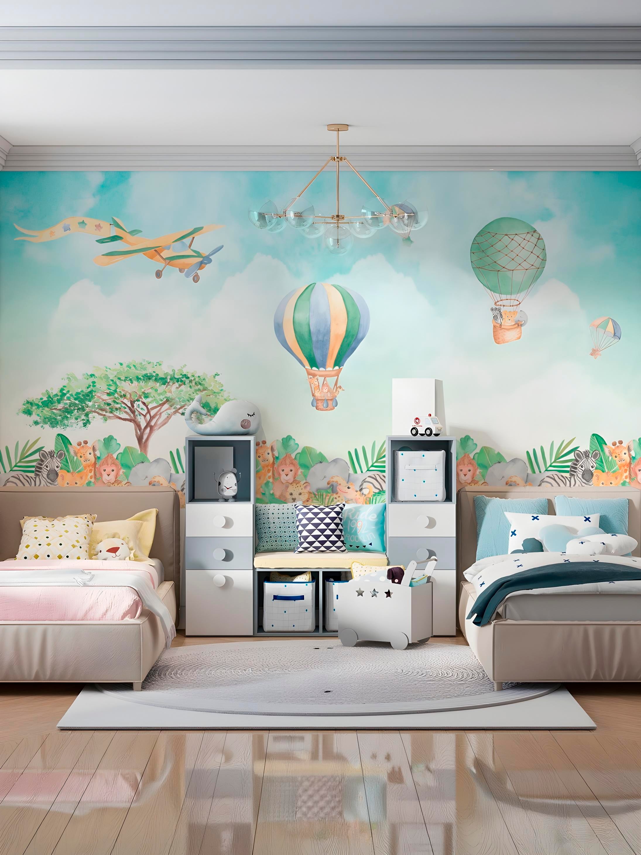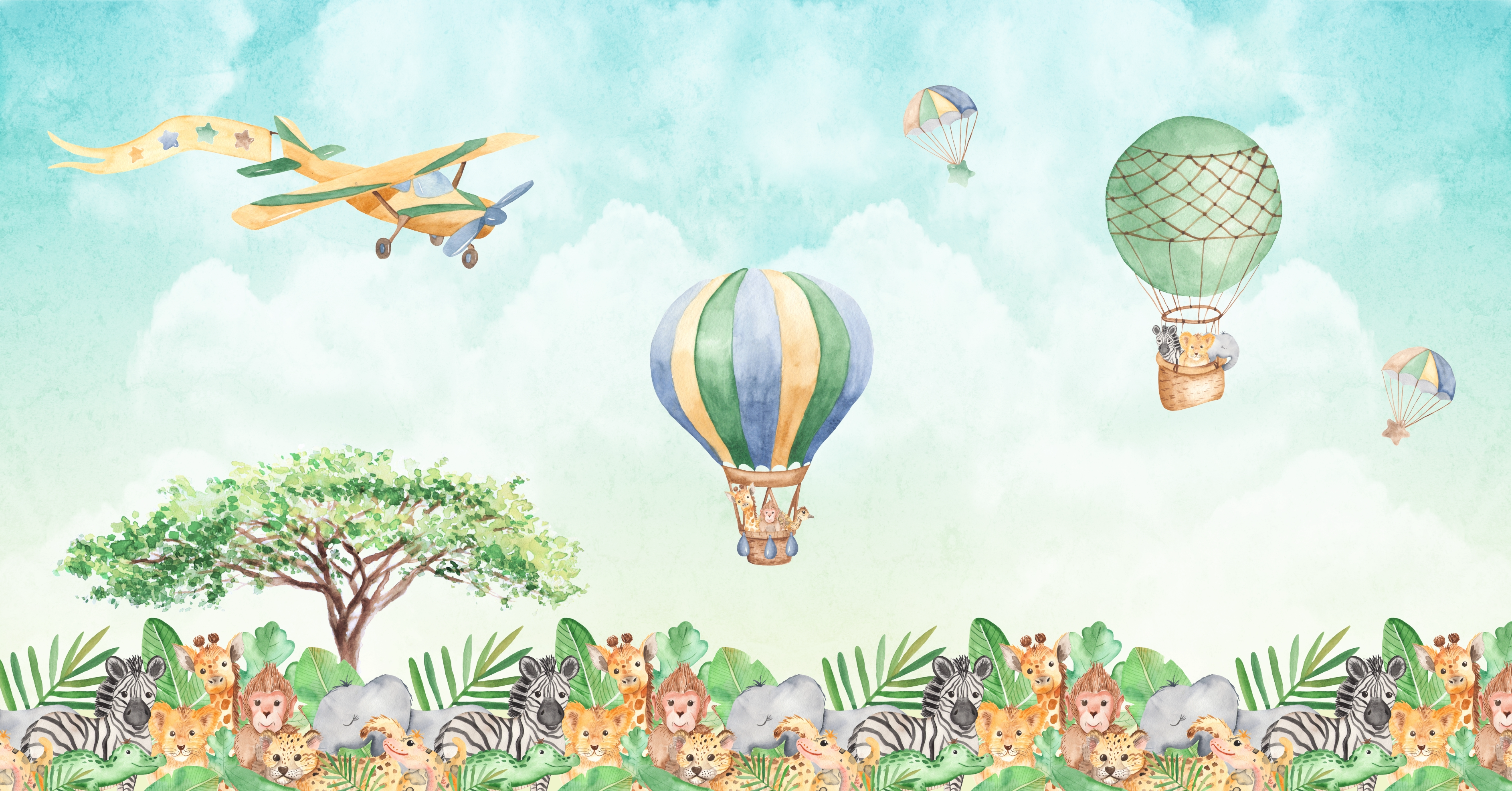Leve a aventura do safari para o quarto das crianças com este papel de parede lúdico. Os balões e os animais da selva, com traços alegres e texturas suaves, estimulam a imaginação e a alegria.