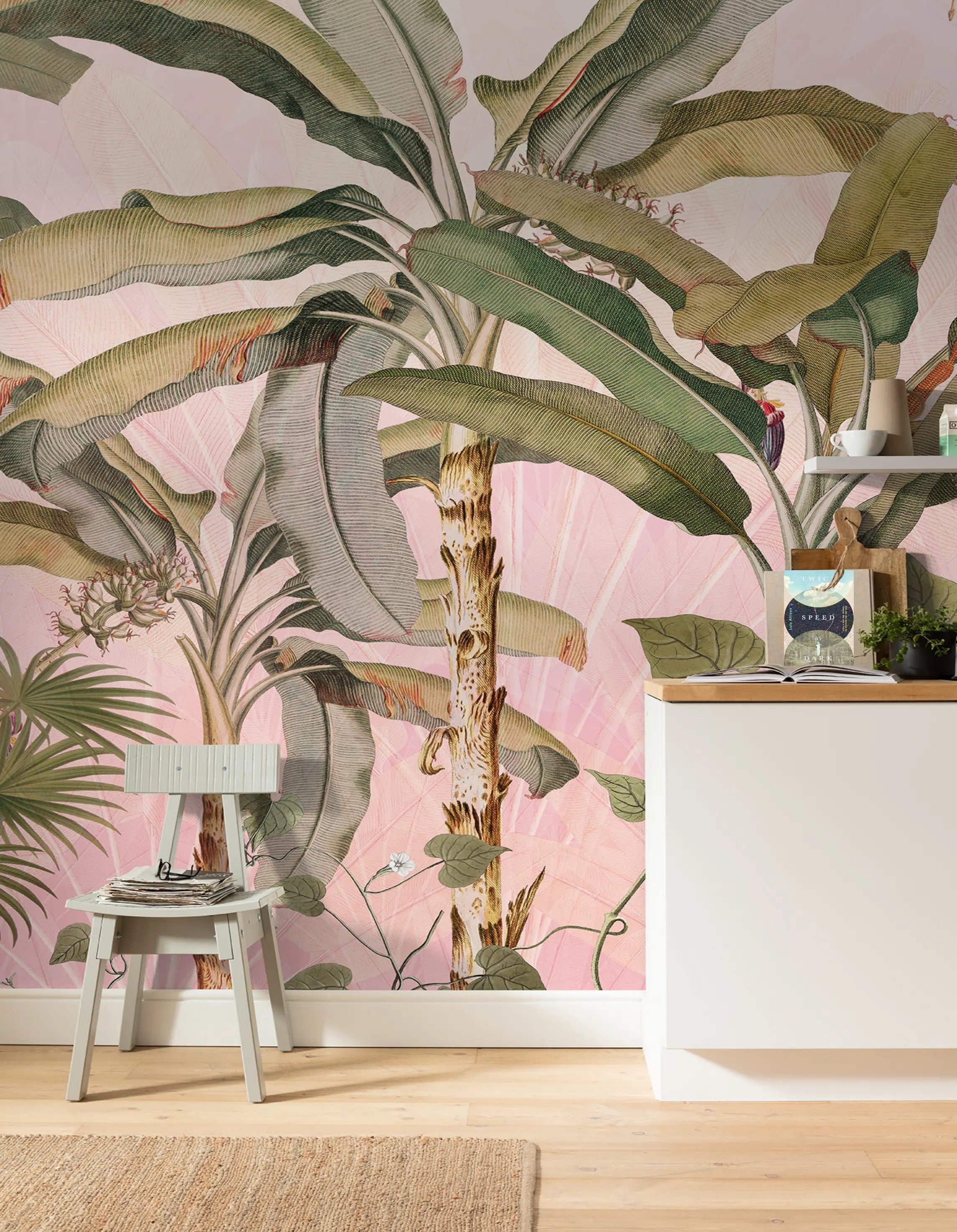 Traga o charme tropical para dentro de casa com este papel de parede que retrata a beleza das bananeiras. As folhagens exuberantes e os tons vibrantes criam um ambiente acolhedor e cheio de estilo.