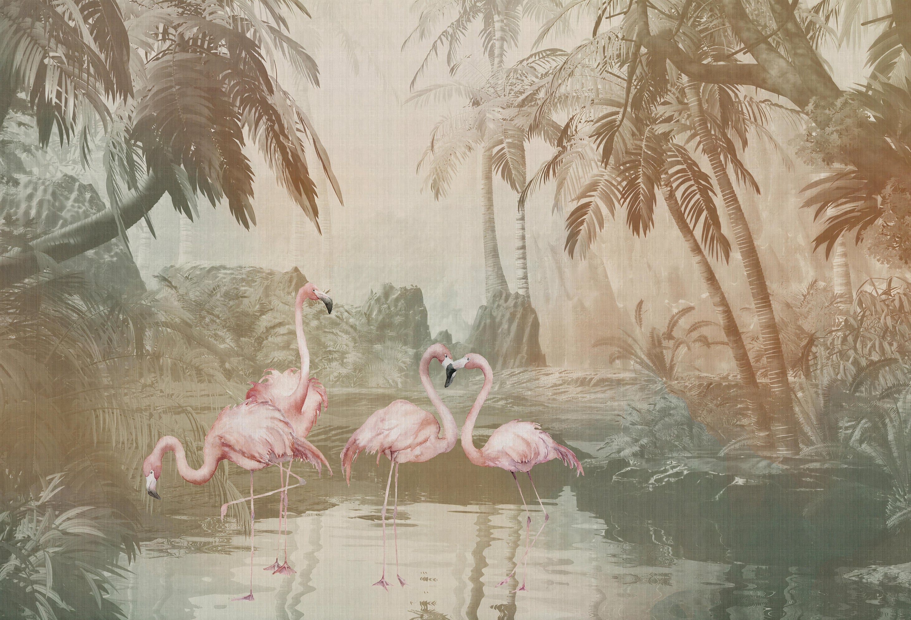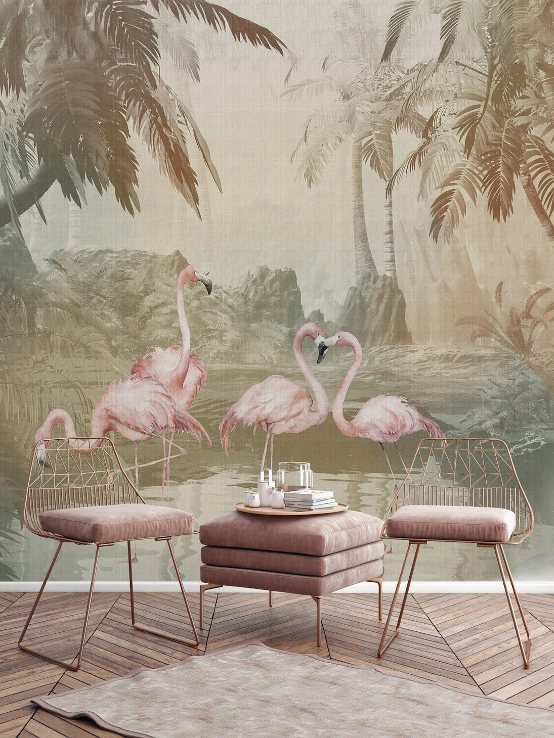Este papel de parede combina a beleza da natureza com um toque de cor e elegância. Os flamingos, representados em meio a elementos florais, trazem um ar tropical e sofisticado ao ambiente.