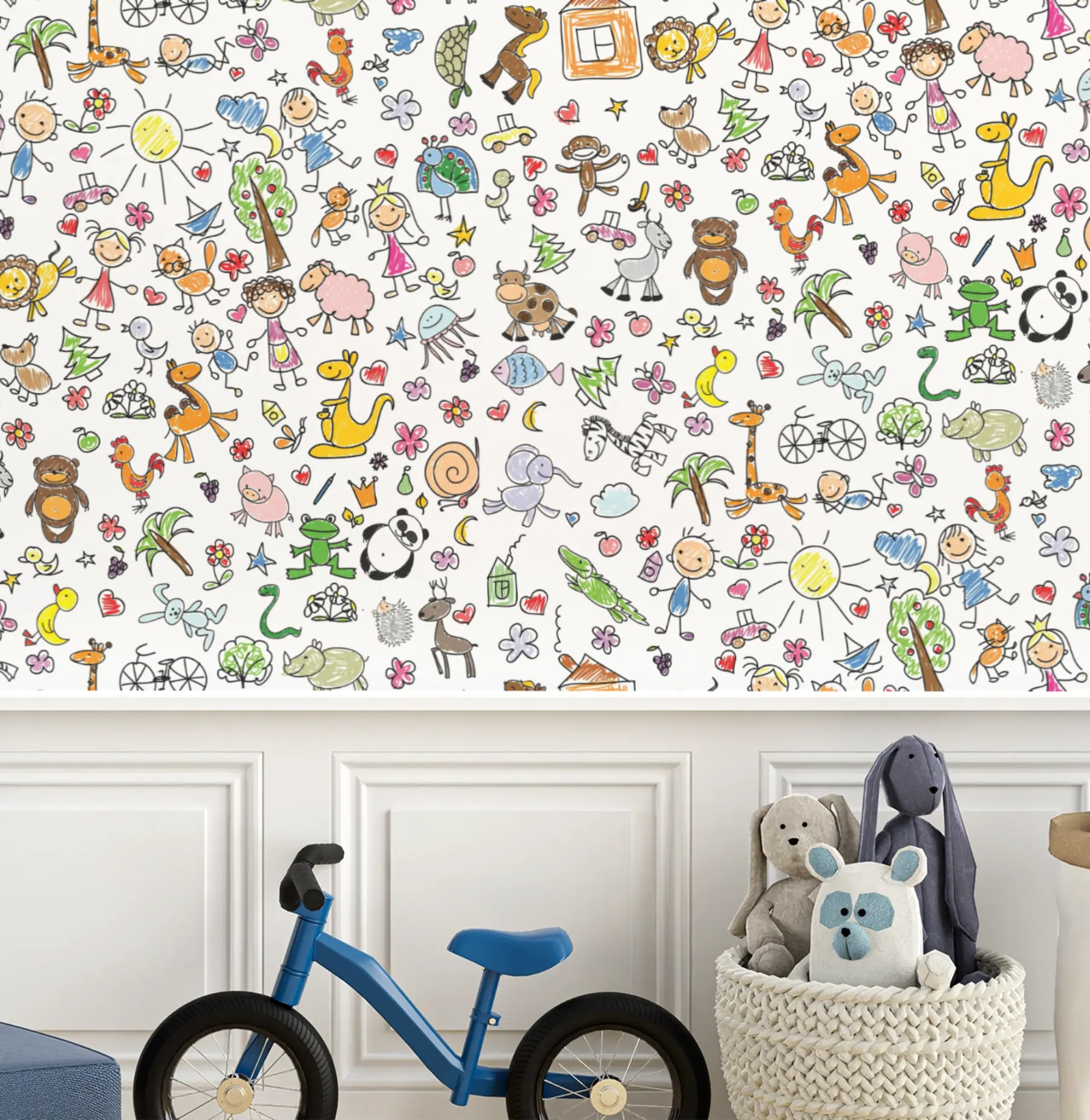Transforme o quarto das crianças em um mundo de fantasia com este papel de parede cheio de desenhos alegres e vibrantes. Perfeito para estimular a imaginação e criar um ambiente acolhedor.