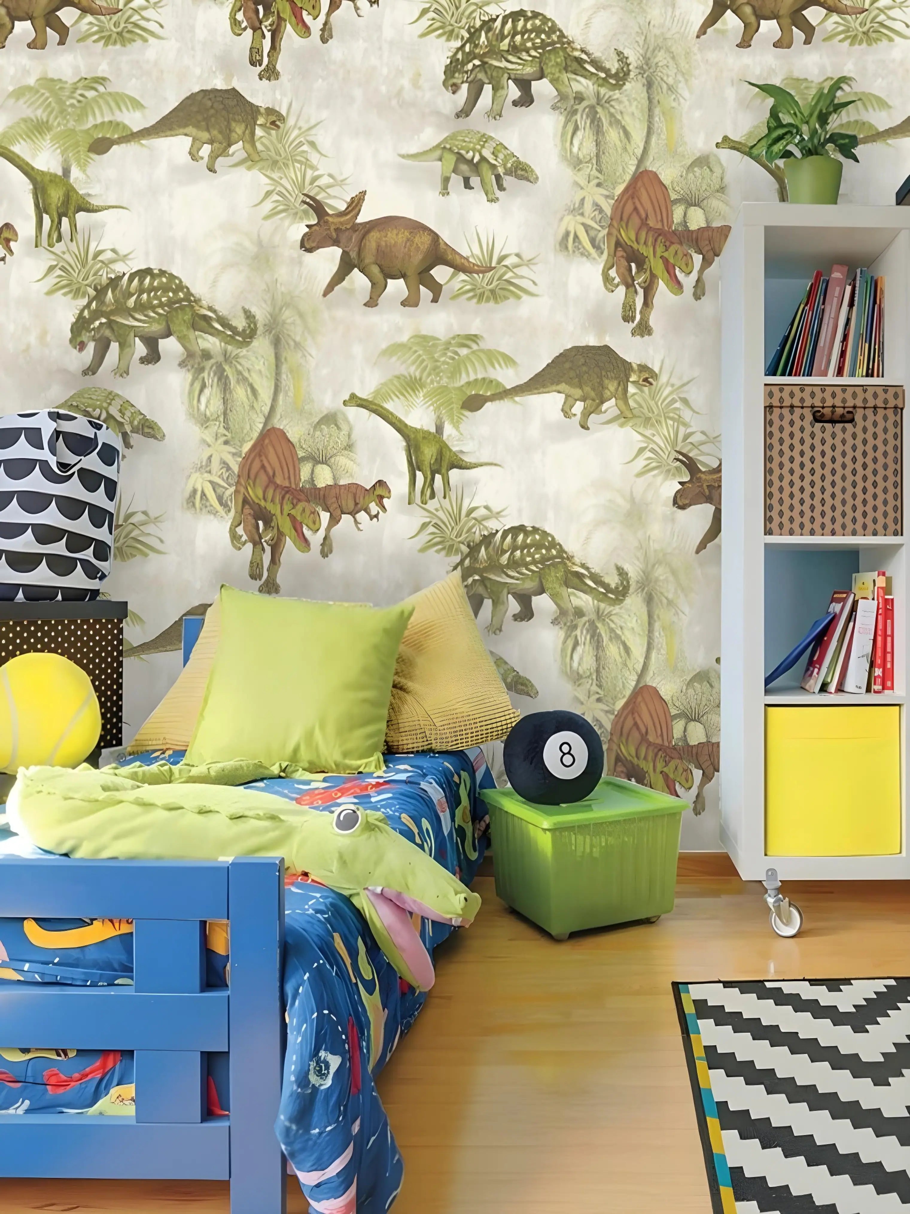 Leve a emoção dos dinossauros para o quarto dos pequenos com este papel de parede cheio de ação e detalhes realistas. Uma decoração que vai encantar os fãs de todas as idades.