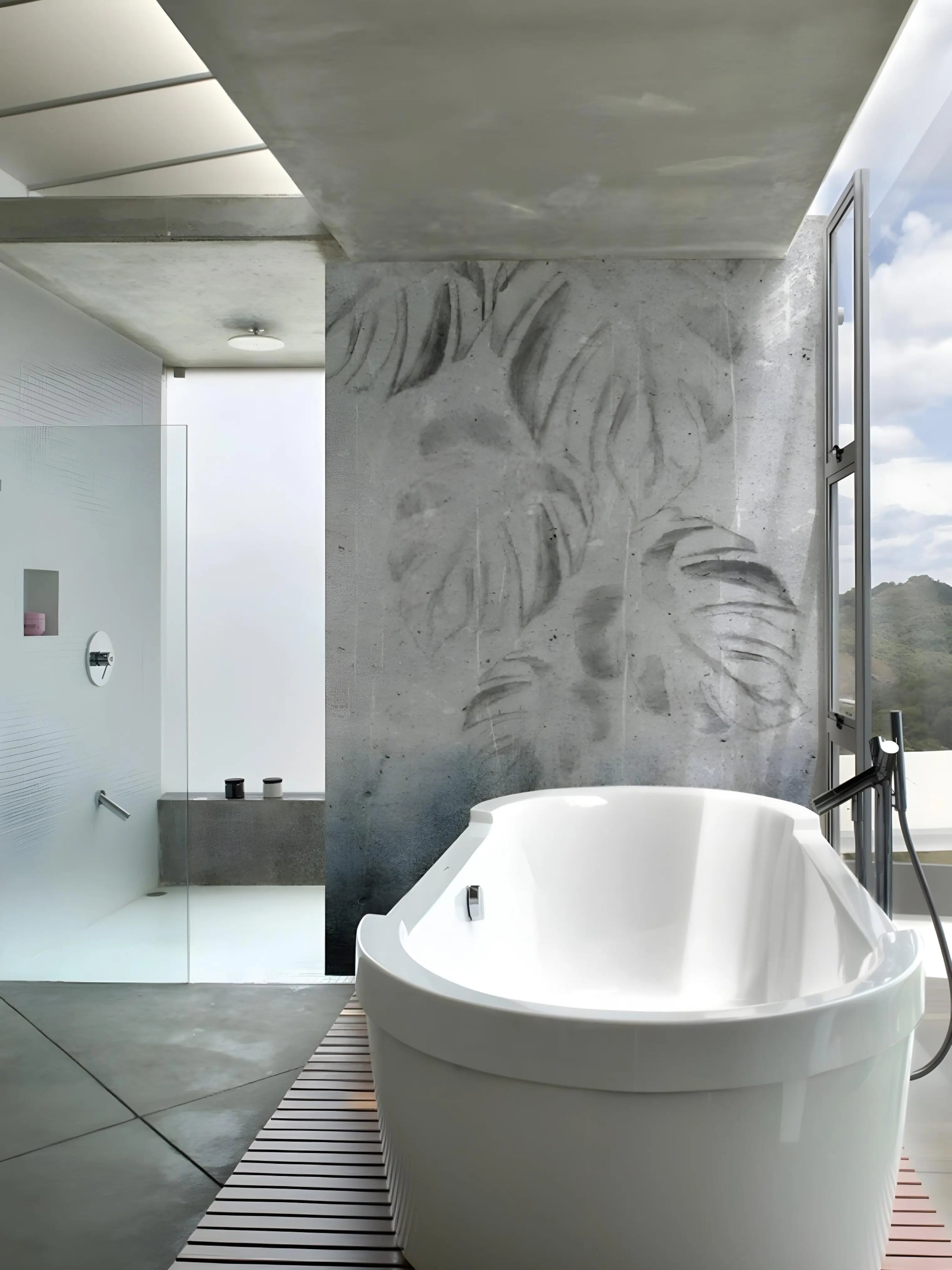 Combine o charme do concreto com a exuberância das folhas de monstera neste papel de parede moderno e elegante. Perfeito para criar um ambiente urbano com um toque de natureza.
