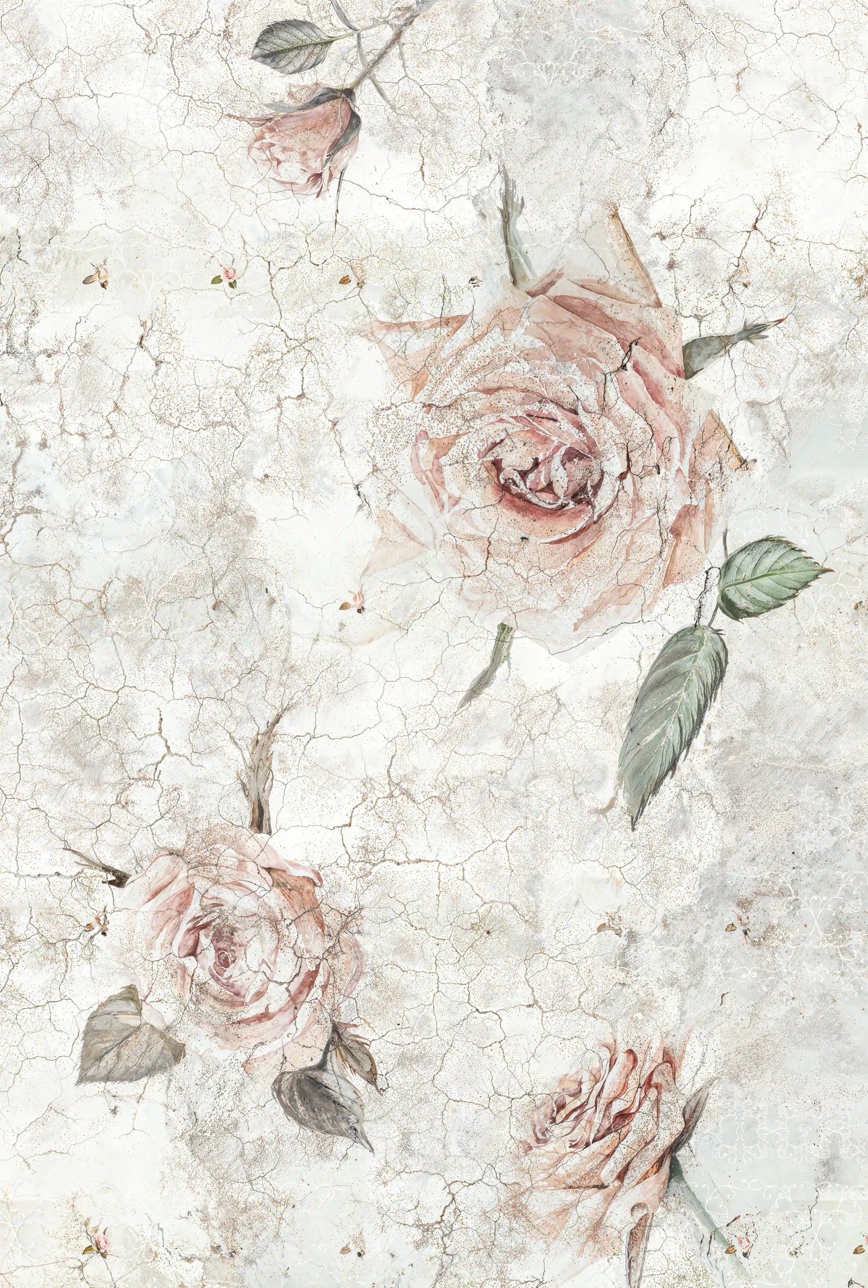 Este papel de parede exala uma elegância romântica com um toque vintage. Rosas delicadas em tons suaves são exibidas sobre um fundo texturizado com efeito envelhecido, criando uma atmosfera nostálgica e sofisticada. Perfeito para adicionar um charme clássico e romântico a qualquer ambiente.