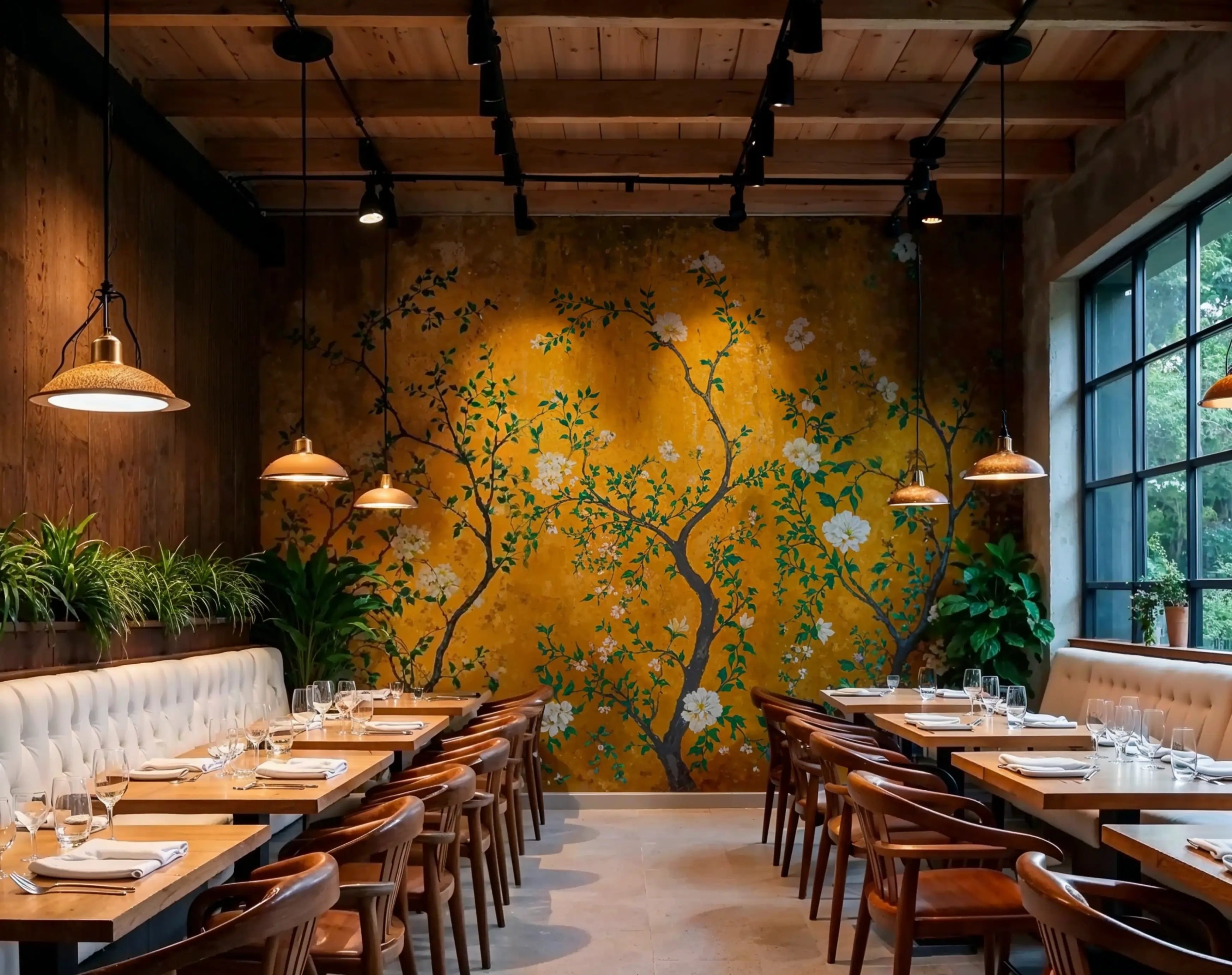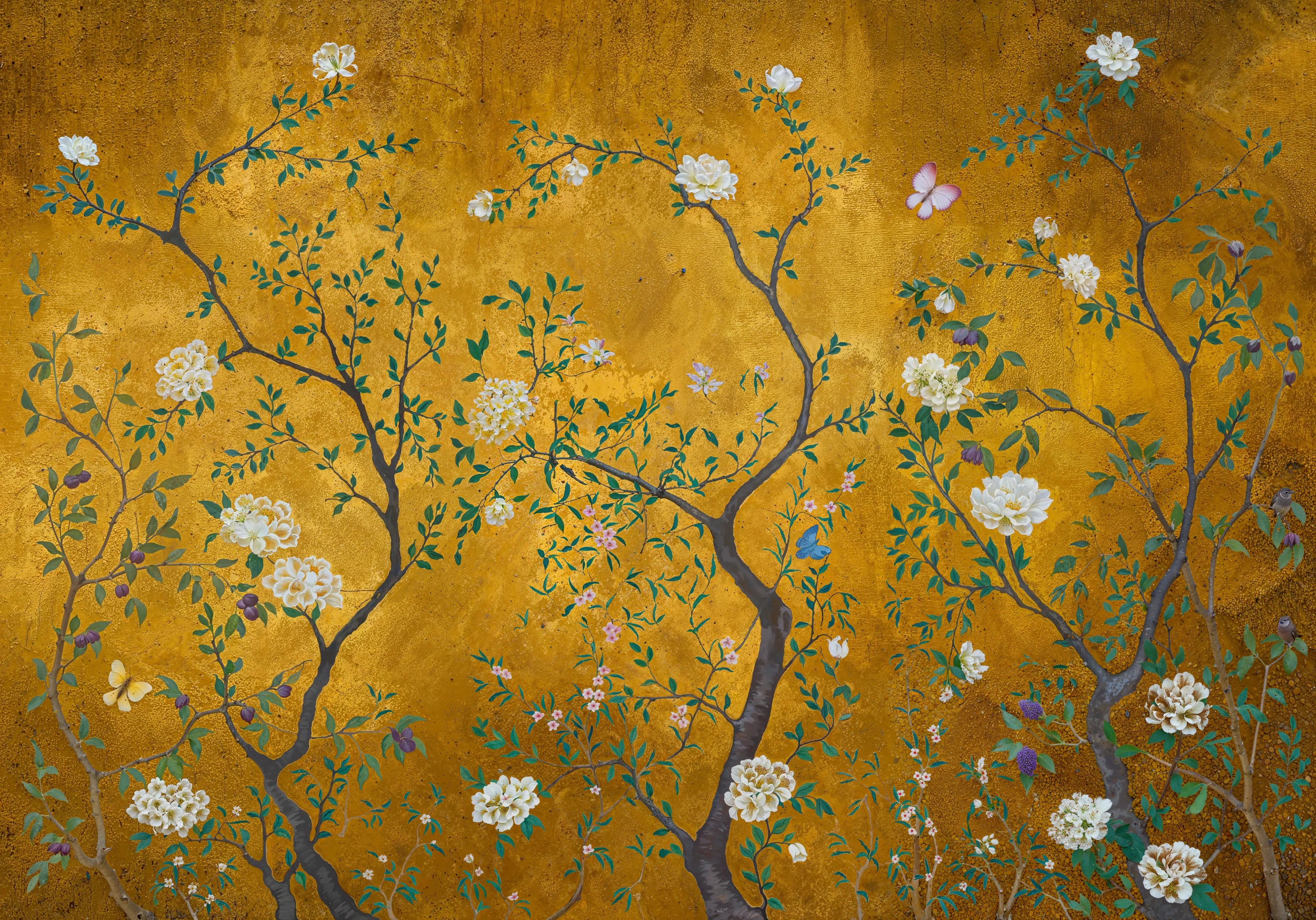 Este papel de parede exala uma elegância oriental com um toque luxuoso. Galhos delicados adornados com flores brancas e borboletas coloridas se destacam em um fundo dourado vibrante. A composição cria uma atmosfera sofisticada e encantadora, perfeita para adicionar um toque de requinte e beleza a qualquer ambiente.