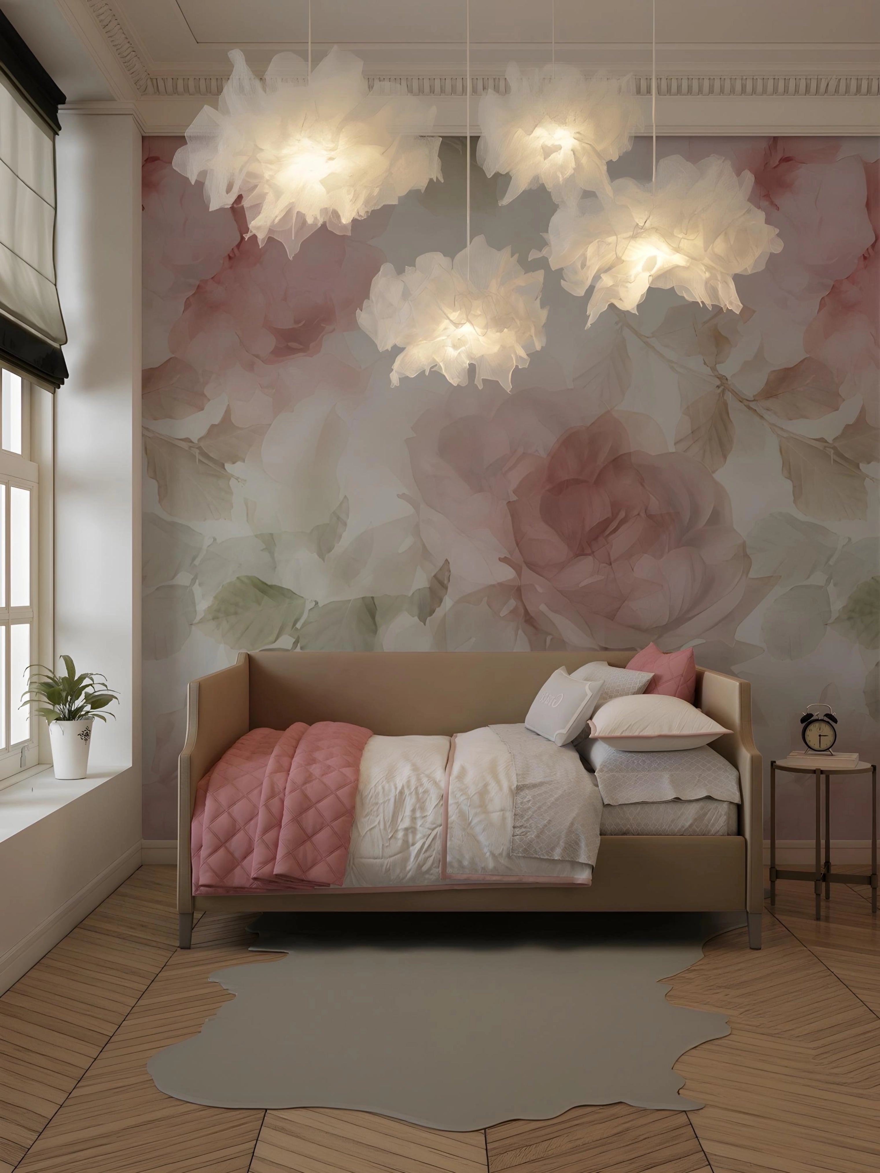 Este papel de parede apresenta uma estampa delicada de flores em tons suaves de rosa, criando uma atmosfera romântica e sofisticada. Disponível em duas versões:
