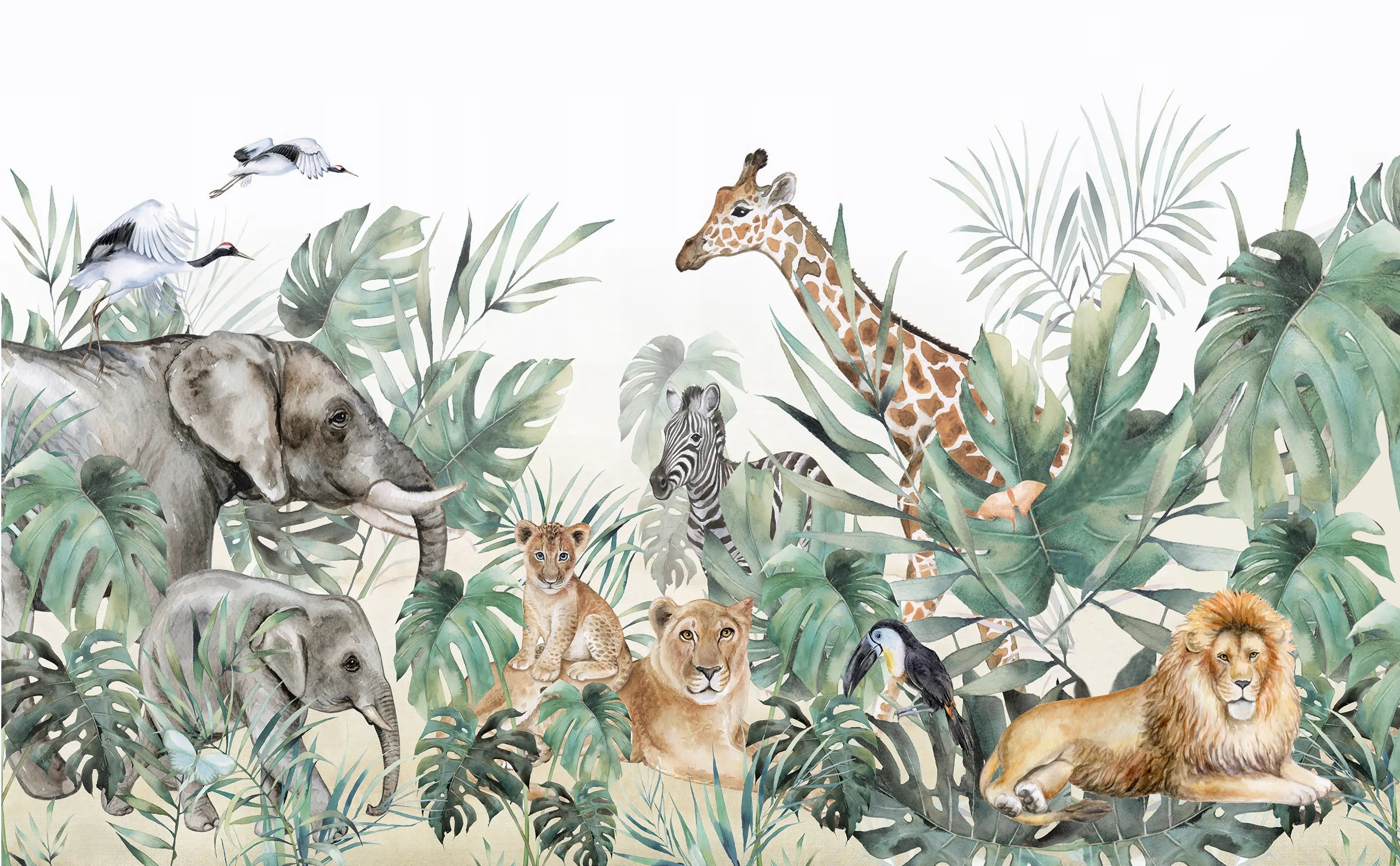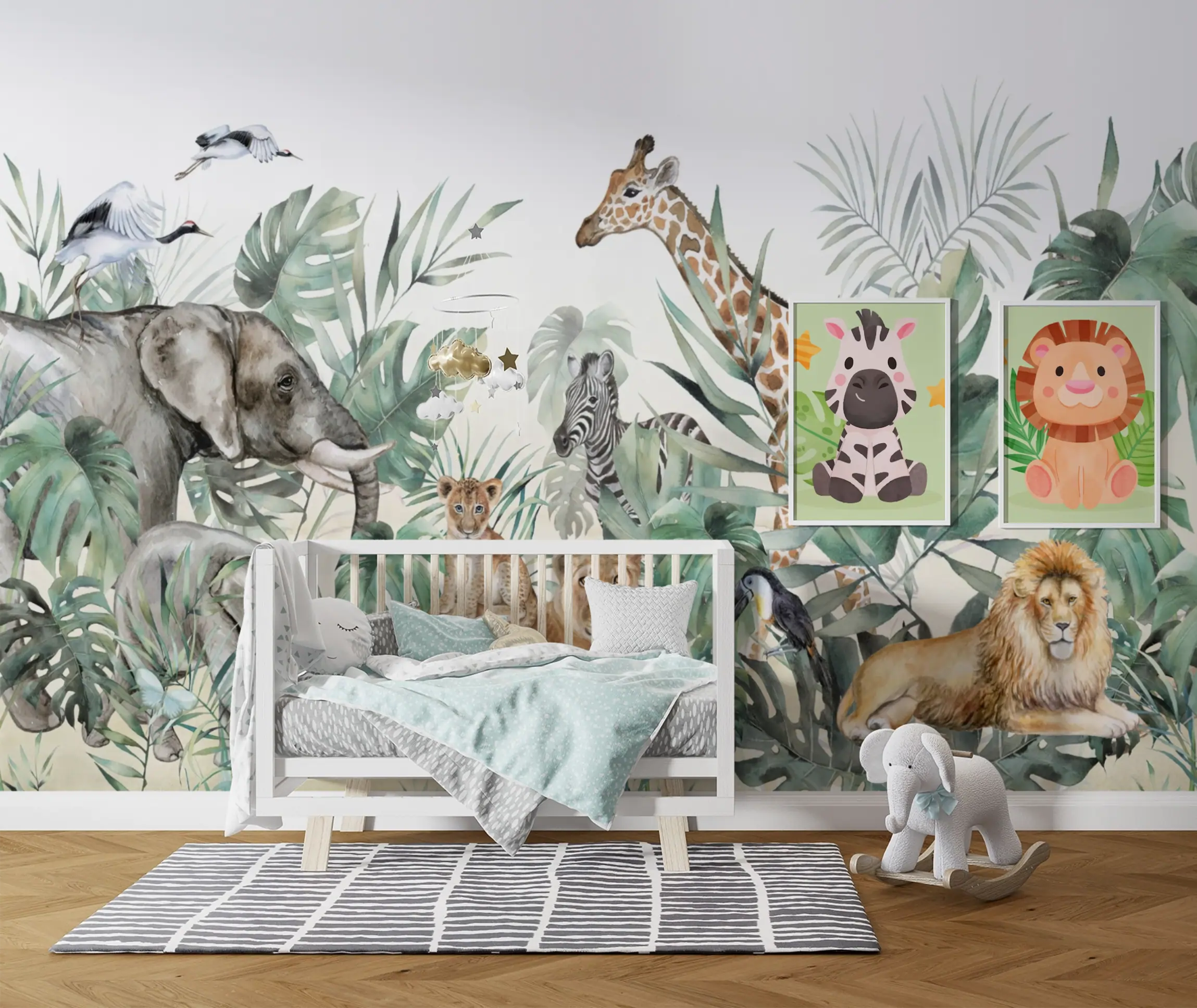 Transforme o quarto das crianças em uma aventura selvagem com este encantador papel de parede que retrata uma vibrante cena de floresta com animais do safari. A ilustração detalhada apresenta leões, girafas, zebras e outros animais exóticos em meio a uma vegetação exuberante, criando um ambiente lúdico e estimulante. As cores suaves e o estilo artístico aquarelado proporcionam uma atmosfera acolhedora e alegre, perfeita para estimular a imaginação dos pequenos. Este design é ideal para compor uma decoração temática de safari ou natureza, adicionando um toque de aventura e diversão ao espaço infantil.
