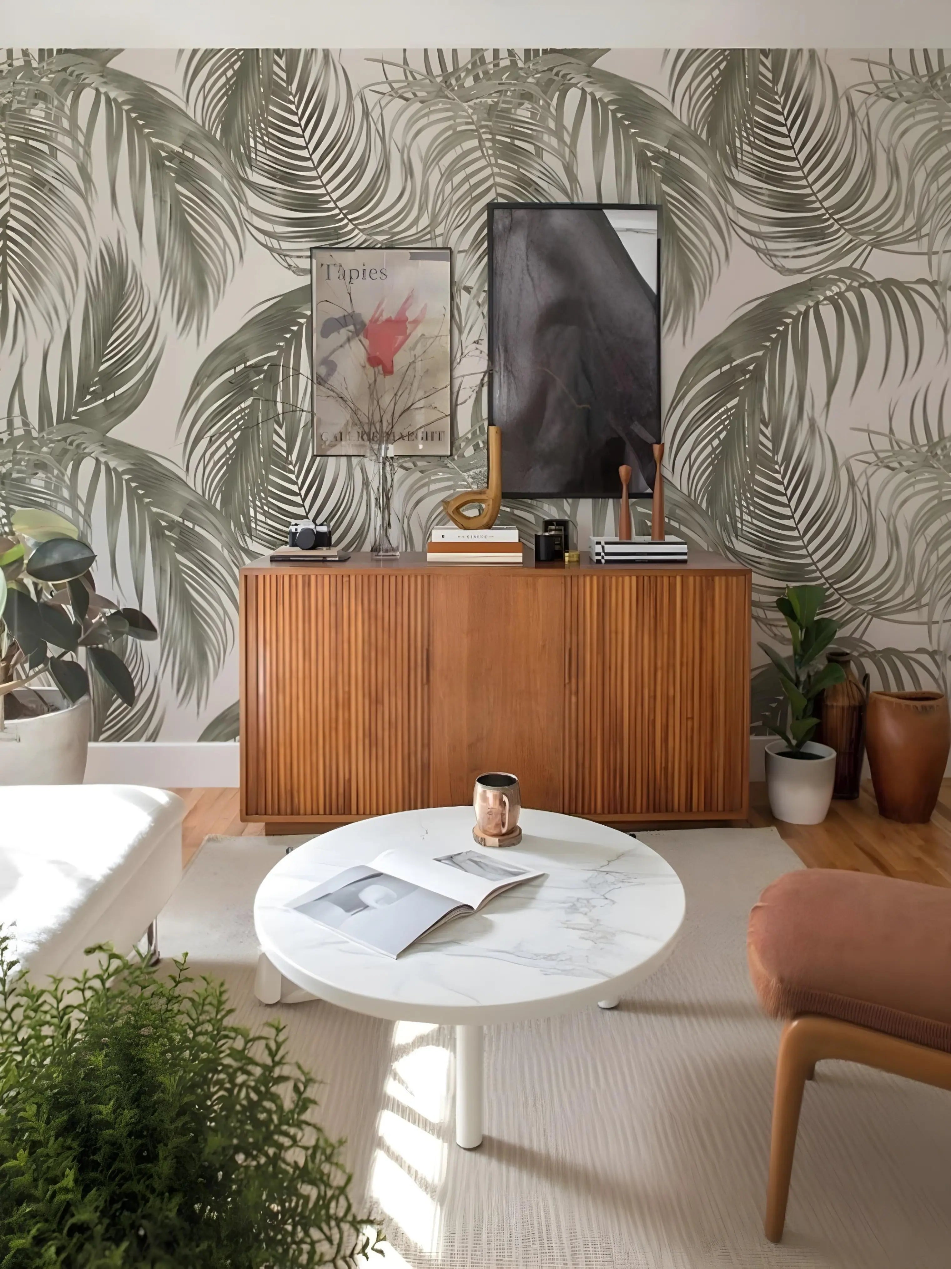 Revitalize sua decoração com o papel de parede "Folhas de Palmeira Tropical". Com um design exuberante e vibrante, este mural traz um padrão de folhas grandes e detalhadas, capturando a essência do clima tropical. A combinação de tons verdes e sutis nuances de bege cria uma atmosfera relaxante e refrescante, perfeita para salas de estar, quartos ou áreas de lazer. Seu estilo botânico, inspirado na natureza tropical, transmite uma sensação de frescor e leveza ao ambiente, ideal para quem busca um toque exótico e moderno em sua casa.