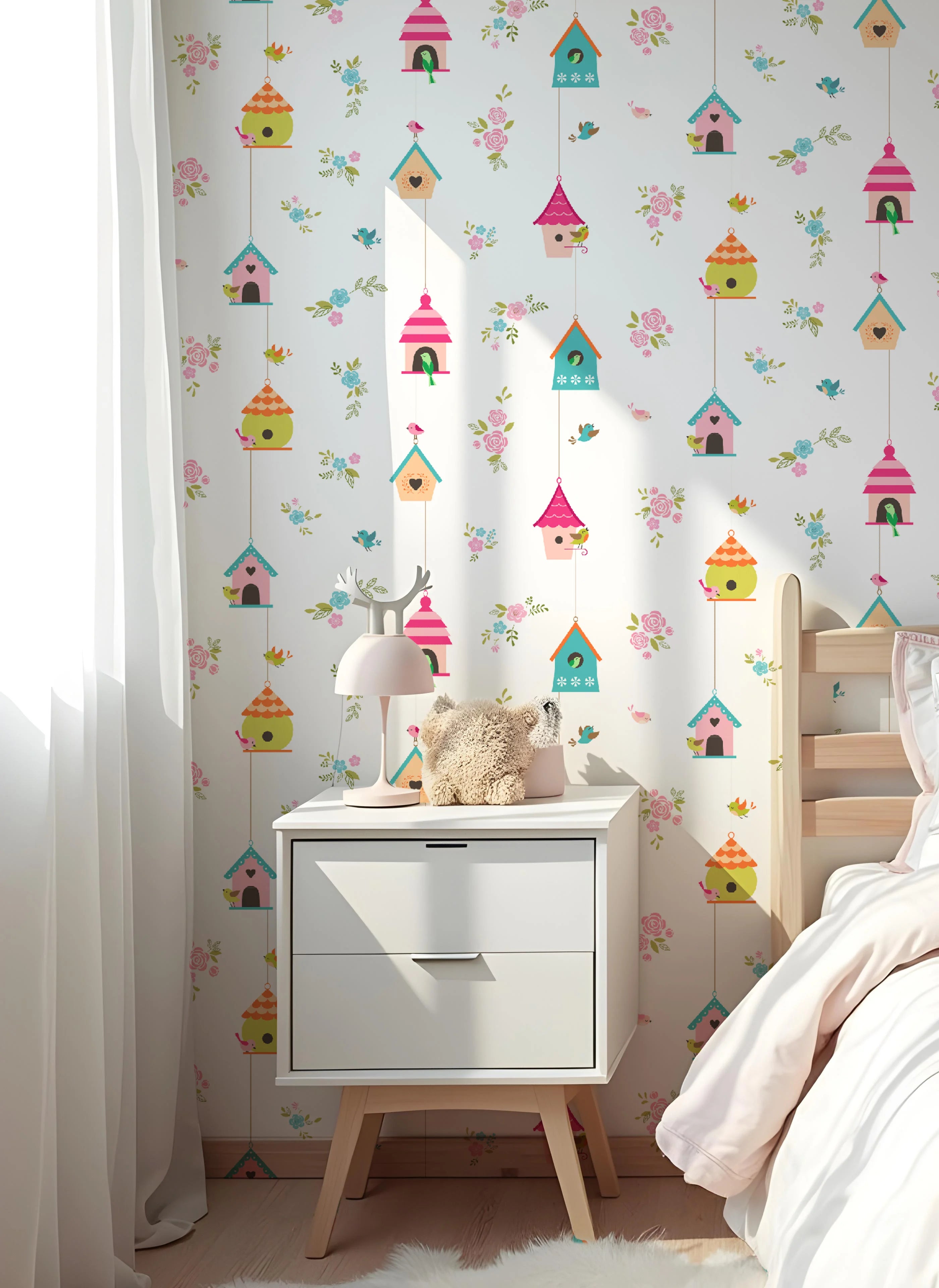 Transforme seu ambiente com um toque lúdico e charmoso! Este papel de parede traz ilustrações delicadas de gaiolas, casinhas e passarinhos, perfeito para decorar espaços com leveza e poesia. Disponível nas opções autocolante texturizado ou tradicional com cola.