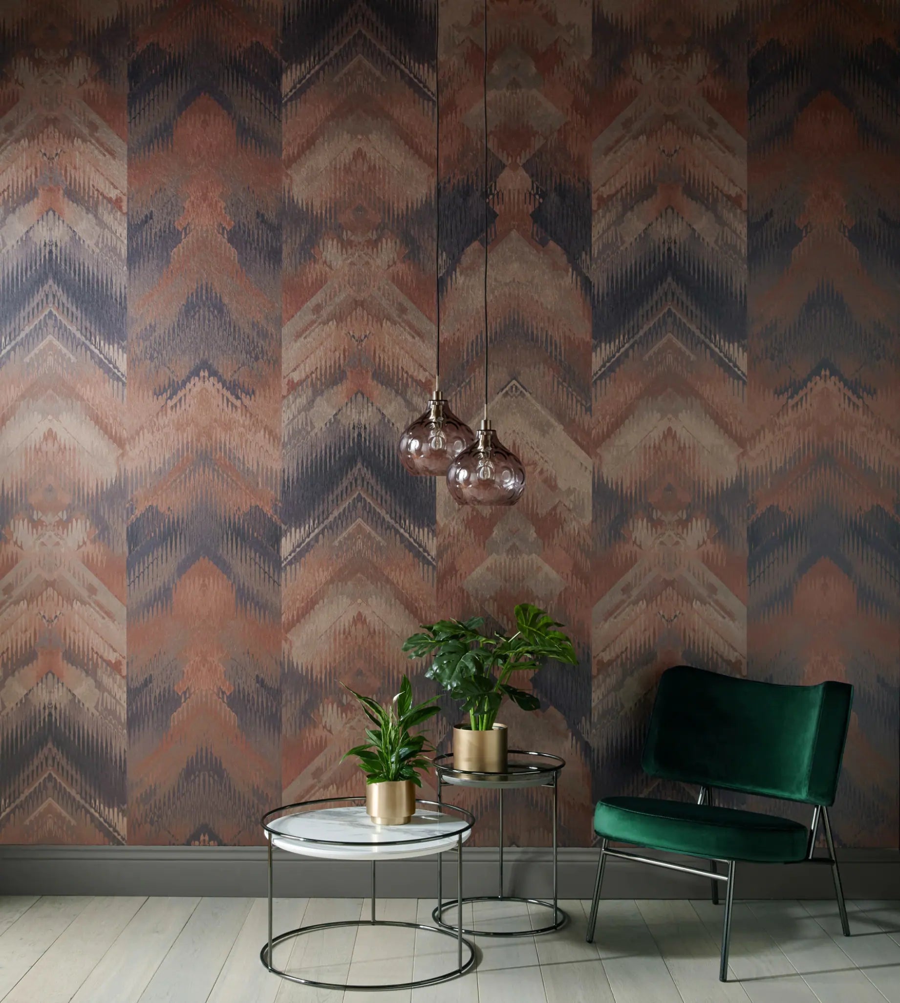 Inspirado no padrão ikat, este papel de parede exibe uma sequência de chevrons estilizados com efeito texturizado que confere movimento e profundidade à composição. Os tons neutros e sofisticados tornam o design versátil, ideal para ambientes contemporâneos ou com toque boho chic. A textura levemente acetinada valoriza ainda mais o efeito visual, funcionando bem em salas, quartos, lavabos ou halls. Além de estético, o padrão ajuda a disfarçar imperfeições da parede e traz aconchego ao ambiente.