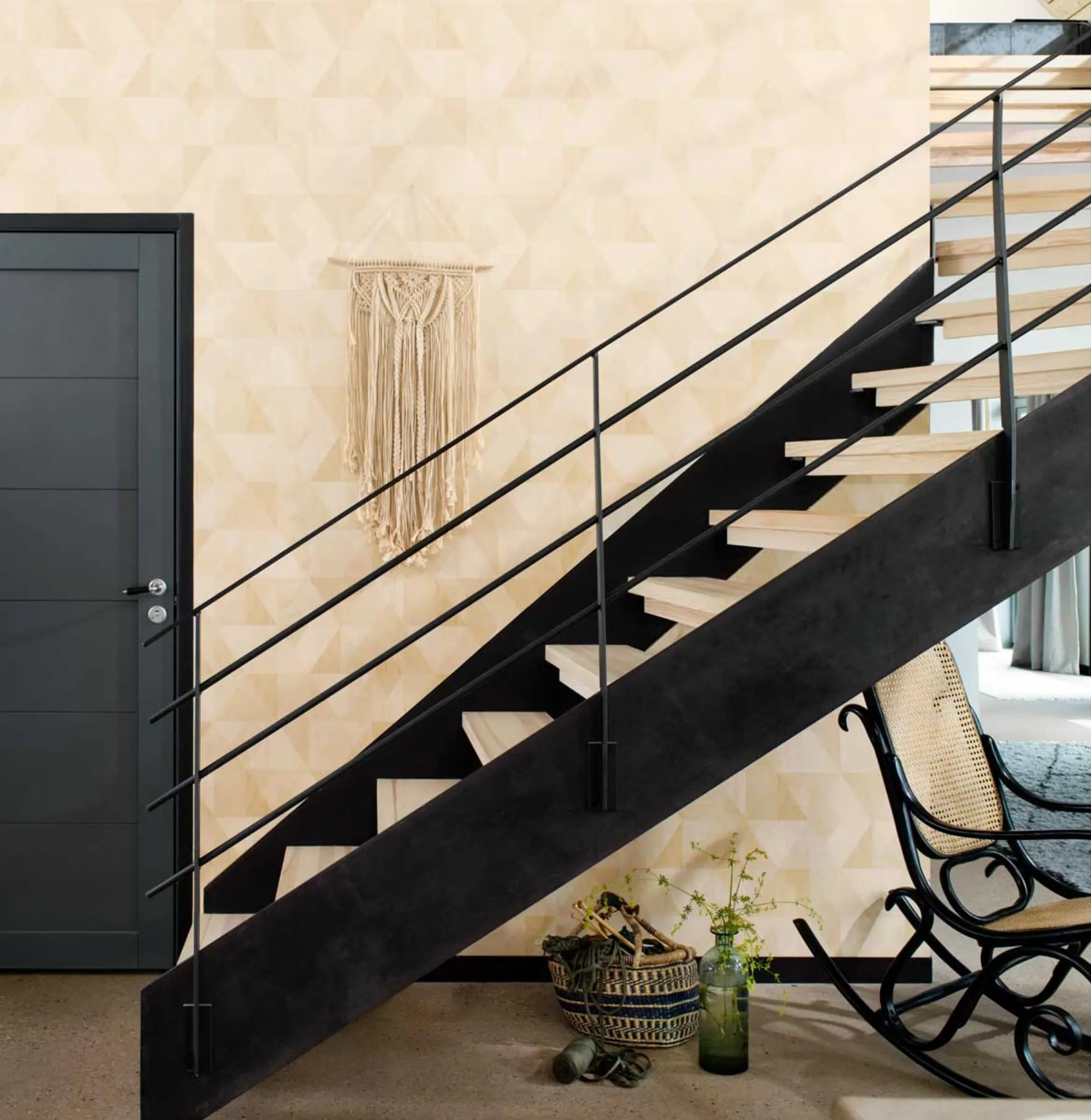 Este papel de parede apresenta um padrão geométrico composto por triângulos em diferentes tons que simulam texturas de madeira natural. A combinação entre formas precisas e o visual rústico cria um equilíbrio entre o moderno e o aconchegante, sendo ideal para ambientes que buscam estilo e personalidade. Perfeito para salas, escritórios ou espaços de convivência, ele adiciona profundidade e sofisticação com seu efeito visual tridimensional.