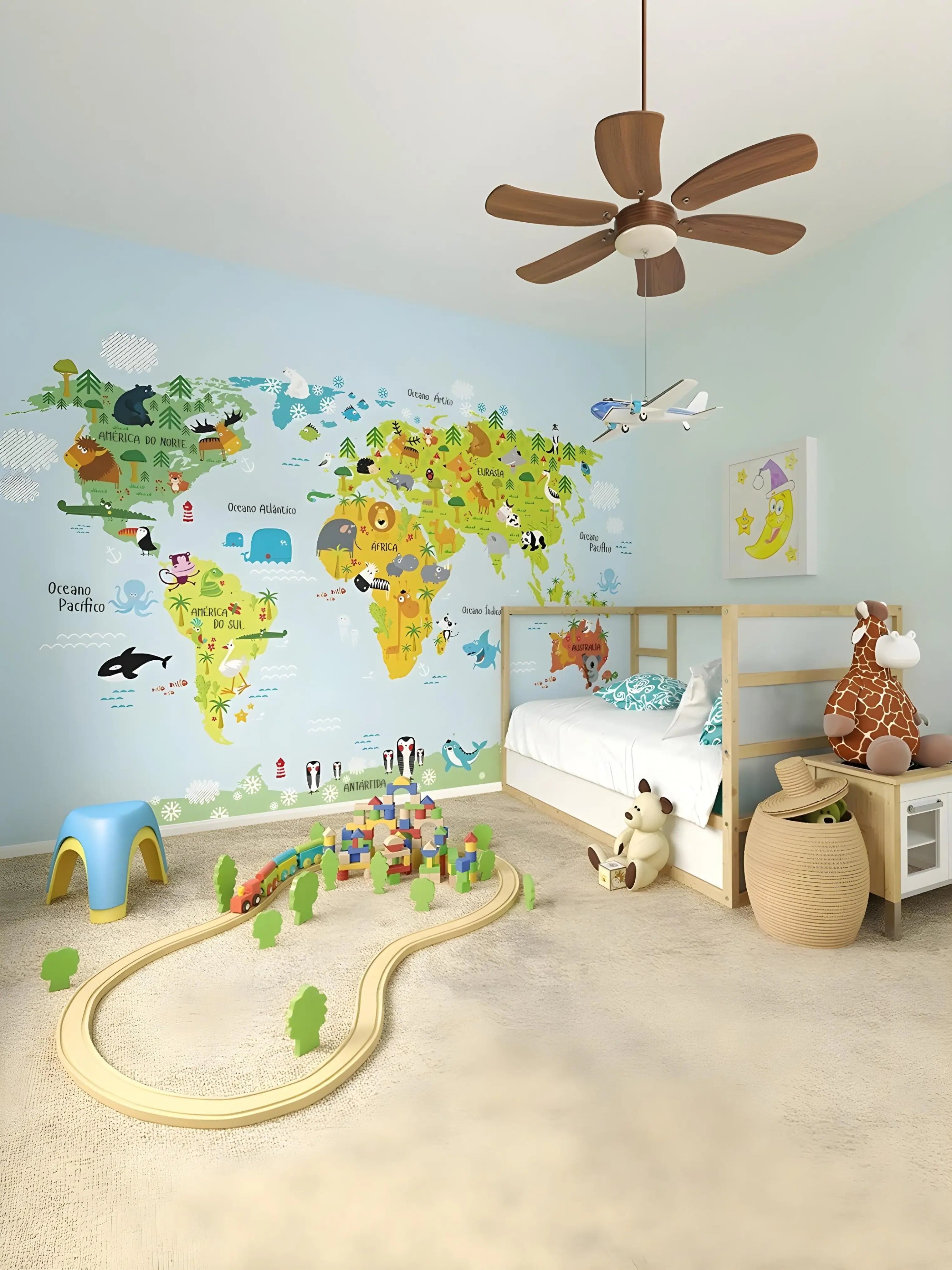 Este papel de parede infantil traz um mapa mundi detalhado, ideal para decorar o quarto das crianças com um toque educativo. O design vibrante e as cores suaves ajudam a criar um ambiente de aprendizado e diversão. Perfeito para despertar a curiosidade sobre o mundo, ele é feito com vinil autoadesivo texturizado ou aplicação convencional com cola, oferecendo praticidade e durabilidade.