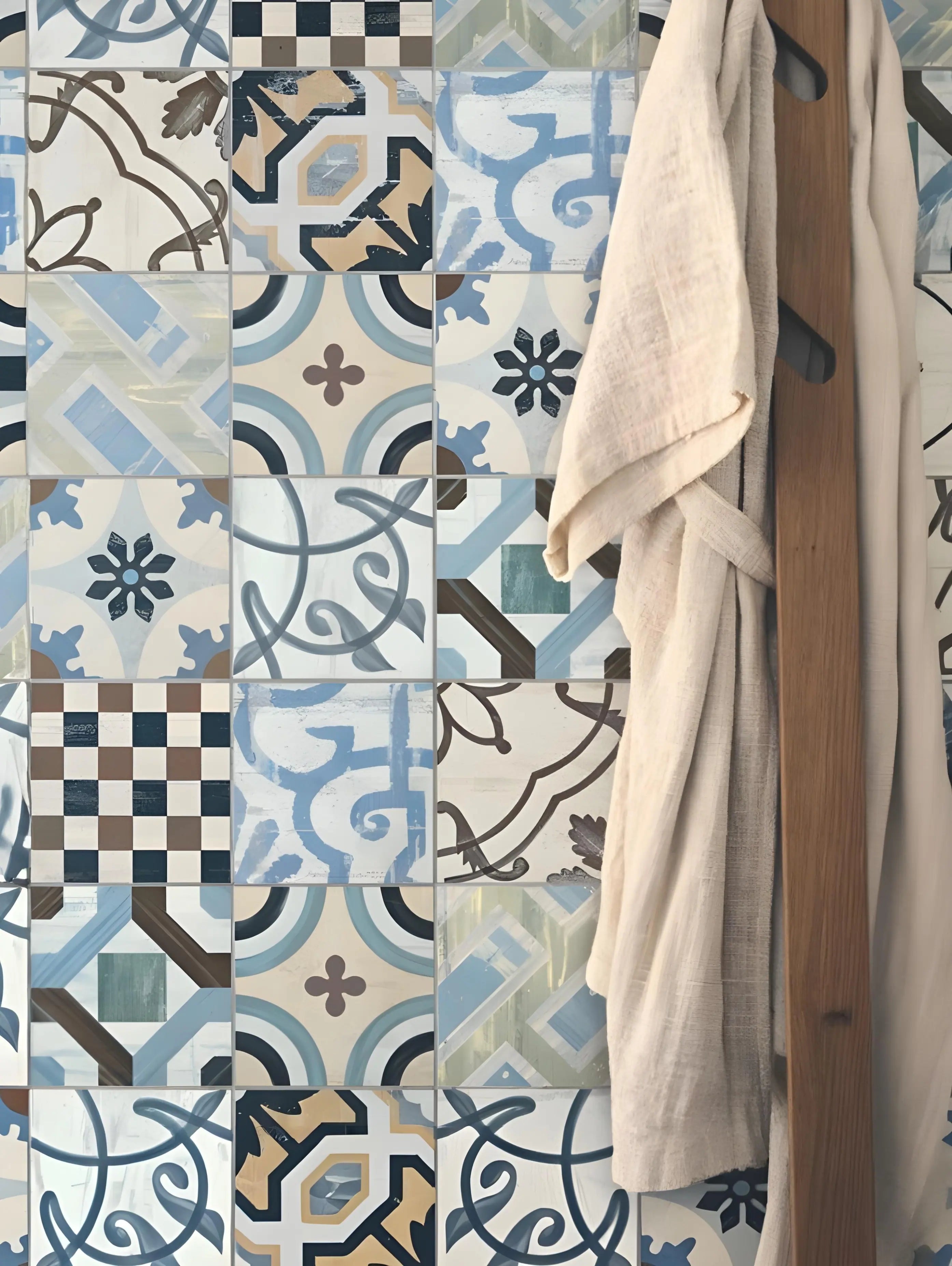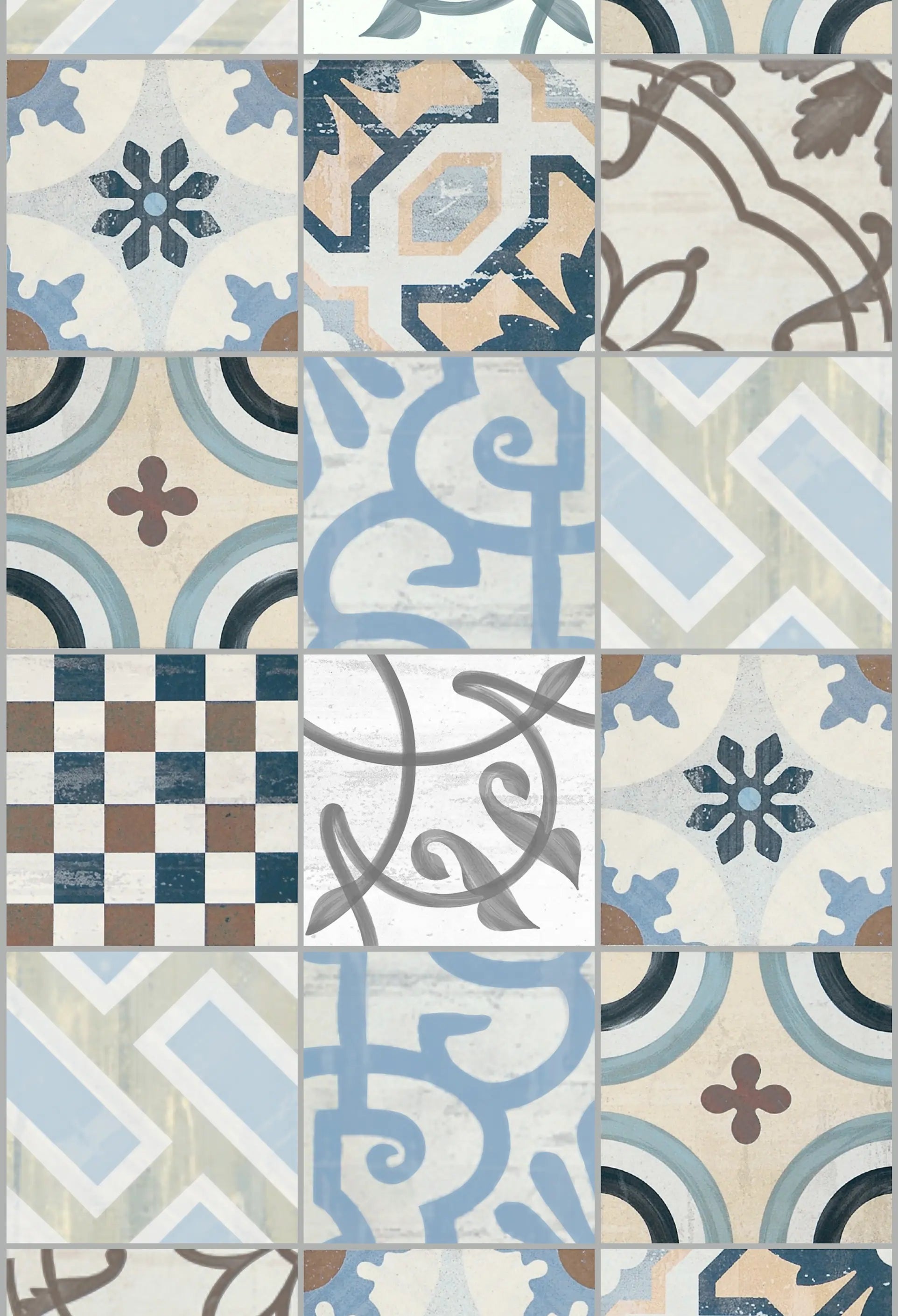 Charme atemporal com padrão geométrico em azul e branco que remete a azulejos hidráulicos retrô. Ideal para cozinhas, lavabos ou ambientes com estilo mediterrâneo, o design simula textura cerâmica de forma realista. Disponível em versão autocolante texturizada ou tradicional com cola, oferece aplicação prática e acabamento refinado.