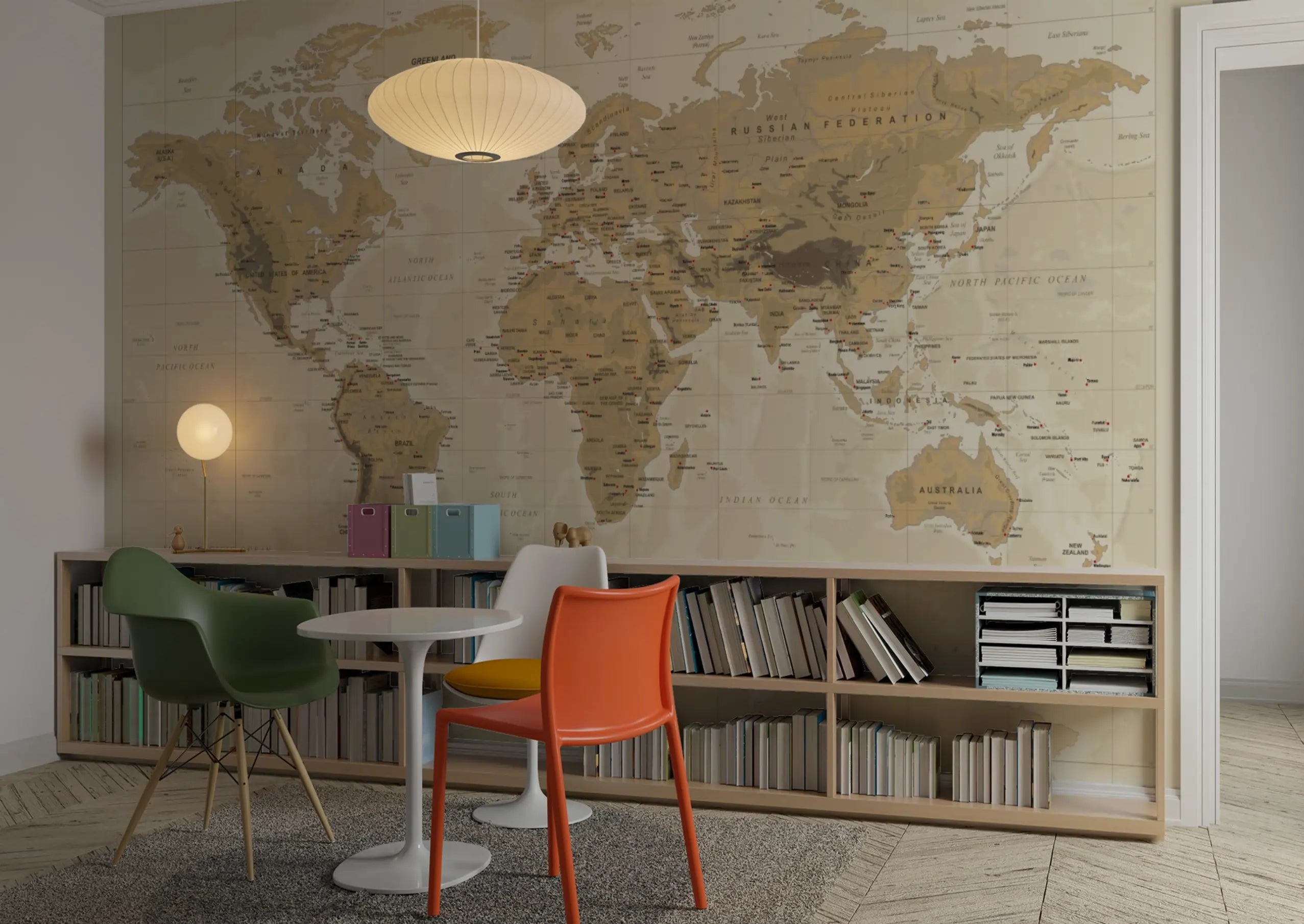 Este papel de parede mapa mundi combina um design elegante com textura em relevo, ideal para criar um ambiente sofisticado e dinâmico. A versão autocolante texturizada oferece praticidade na instalação, sendo perfeita para projetos DIY. Resistente à umidade, é adequado para lavabos, banheiros e qualquer ambiente que precise de um toque único. Também disponível na versão tradicional aplicada com cola, para um acabamento duradouro e detalhado.