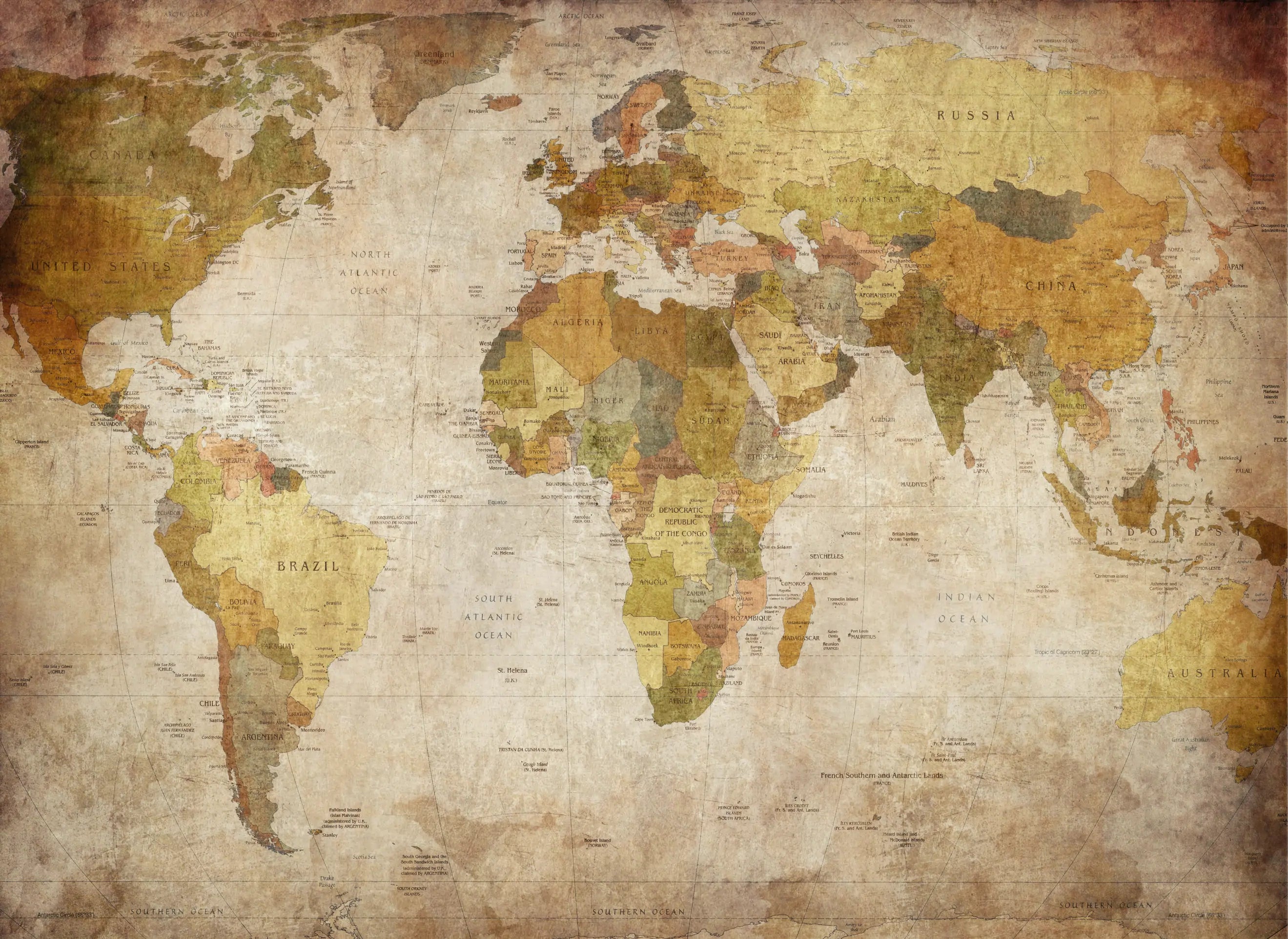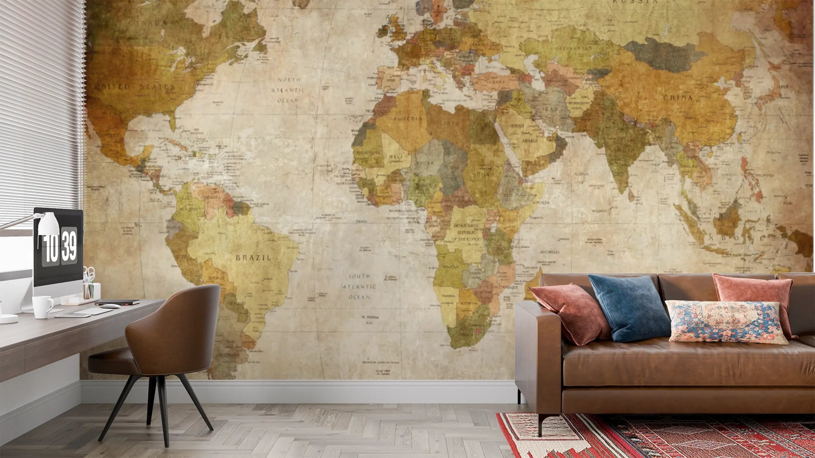 Este papel de parede apresenta um mapa-múndi com estética vintage, destacando tons terrosos e texturas que remetem a pergaminhos antigos. A composição em cores como sépia, marrom e bege confere um visual envelhecido e elegante, ideal para ambientes que buscam um toque histórico e sofisticado. Disponível em vinil autoadesivo texturizado ou versão tradicional com cola, adapta-se a diversos espaços, incluindo escritórios, salas de estar e quartos temáticos. Sua textura em relevo disfarça imperfeições da parede e adiciona profundidade ao ambiente.