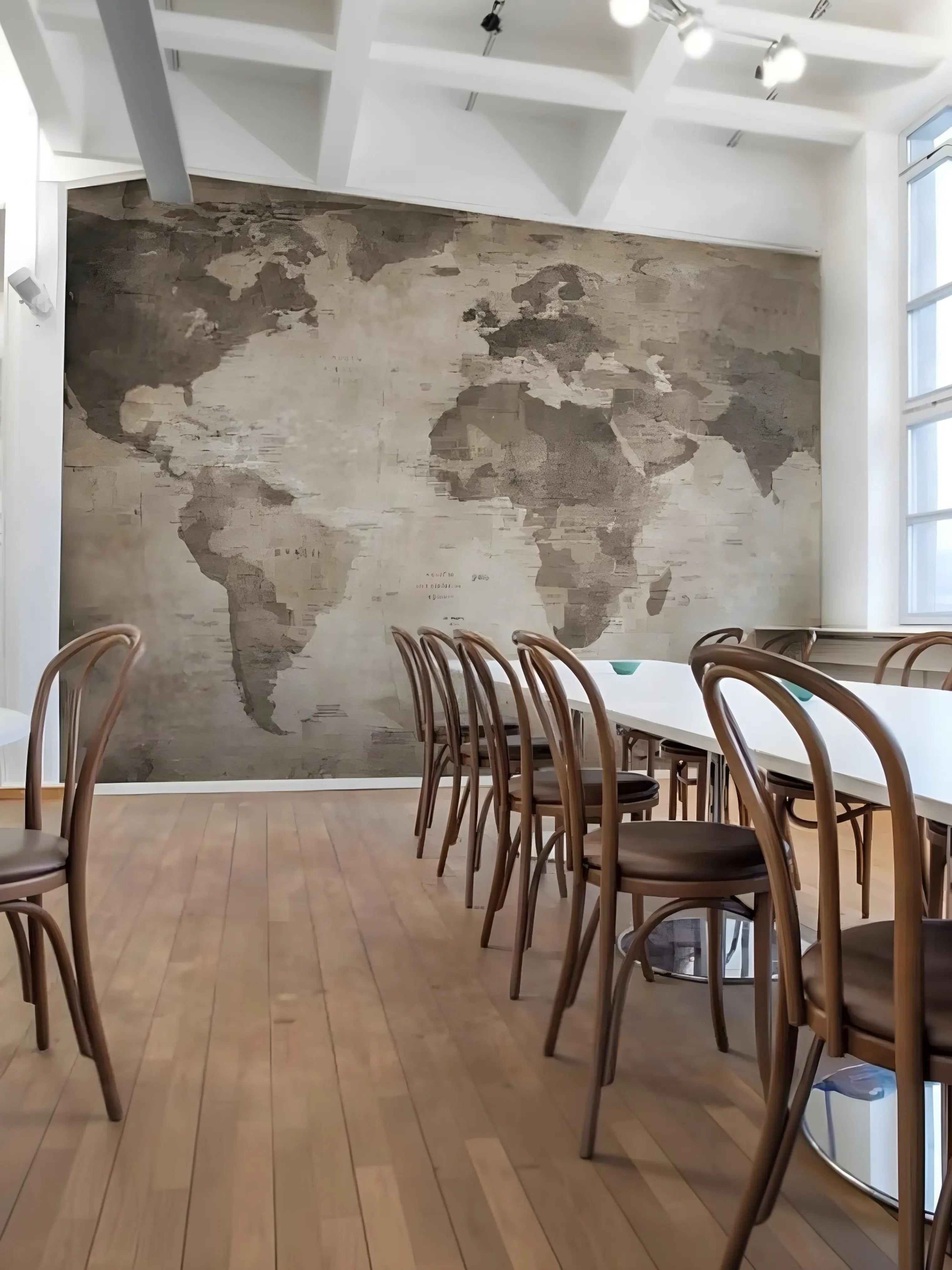 Este papel de parede apresenta um mapa mundi em tons sépia e marrons envelhecidos, criando uma atmosfera vintage e sofisticada. A textura sutil adiciona profundidade ao design, tornando-o ideal para ambientes como escritórios, salas de estar ou espaços comerciais que buscam um toque clássico e elegante. Disponível nas versões autocolante texturizado, que facilita a aplicação, e tradicional com cola, atendendo às preferências de instalação. Produzido sob medida para se adequar perfeitamente ao seu espaço.