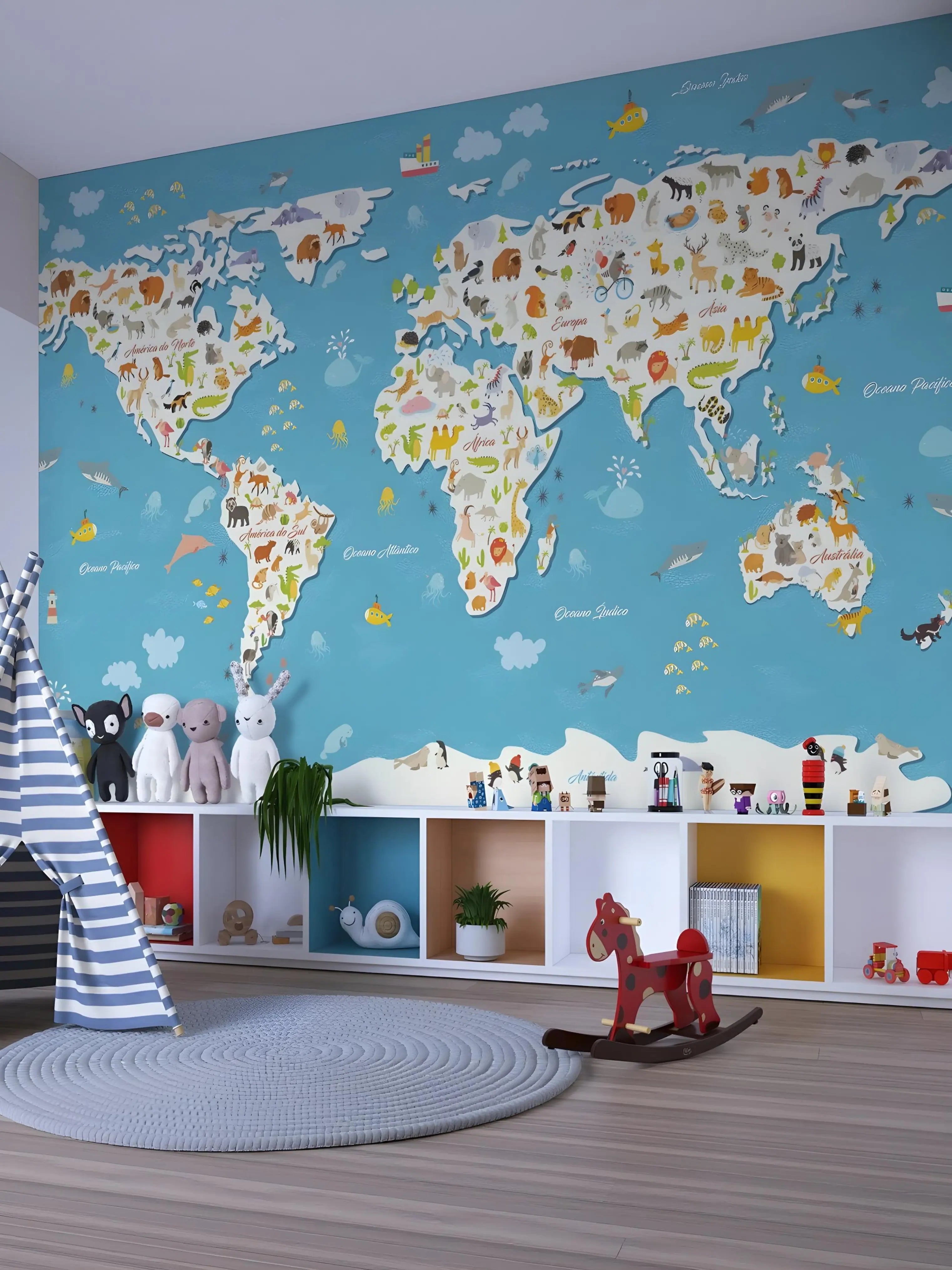 Transforme o quarto infantil em um espaço de aprendizado e diversão com este encantador papel de parede mapa mundi. Ilustrado com animais coloridos representando cada continente, ele estimula a curiosidade e o interesse pelas diferentes culturas e geografias do mundo. Com cores suaves e design lúdico, é perfeito para crianças de todas as idades. Disponível nas versões autocolante texturizado, que facilita a aplicação e disfarça imperfeições da parede, e tradicional aplicado com cola, oferecendo durabilidade e acabamento refinado. Ambas as opções são resistentes à umidade, antimofo e antibacterianas, garantindo segurança e higiene no ambiente infantil.