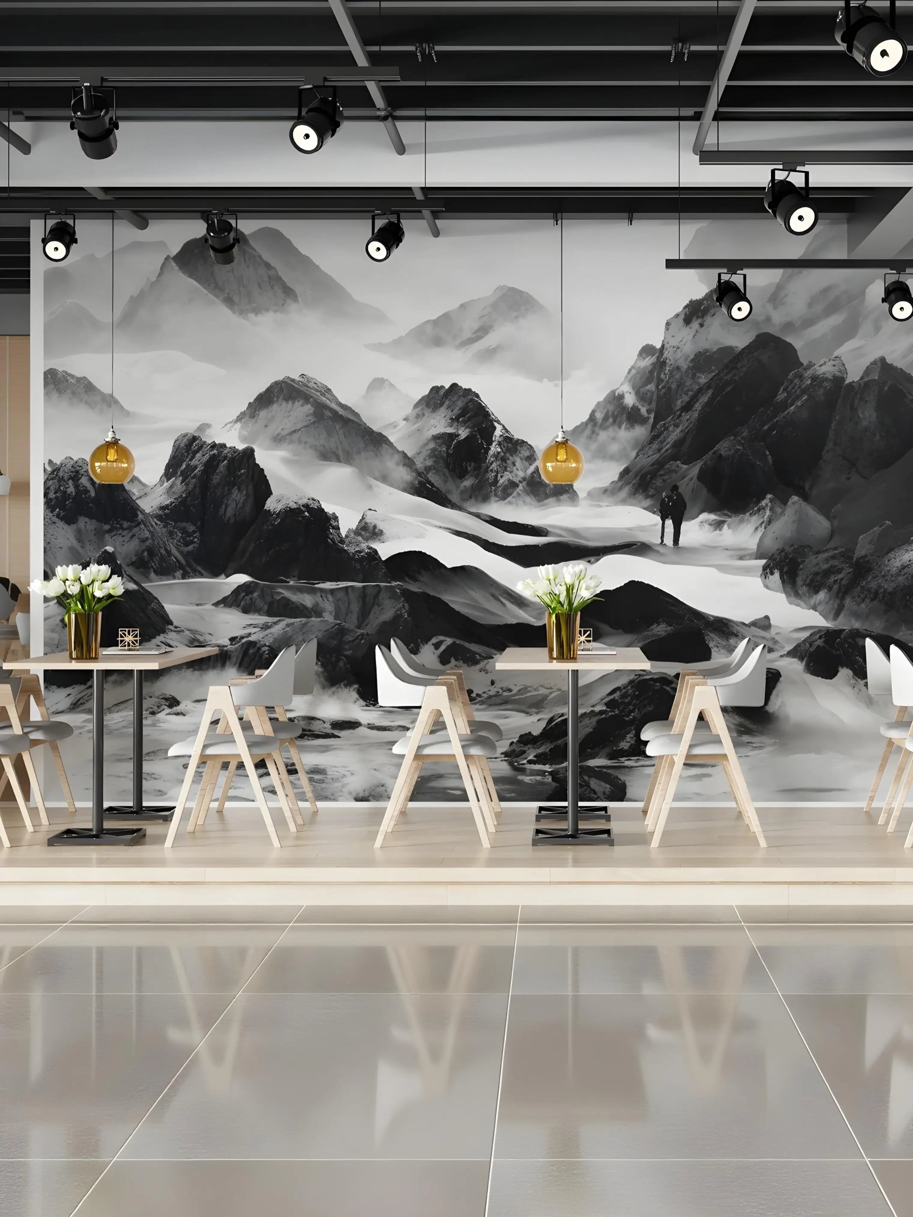 Este papel de parede apresenta uma delicada e elegante paisagem de montanhas sobrepostas em tons de preto, branco e cinza suave, criando profundidade e serenidade em qualquer ambiente. O design minimalista remete à estética escandinava, com linhas suaves, formas orgânicas e composição leve, ideal para quem busca um toque moderno e natural. A paleta neutra facilita a harmonização com diferentes estilos de decoração, desde quartos infantis até ambientes contemporâneos e sofisticados. Um convite ao equilíbrio visual e à calma do ambiente.
