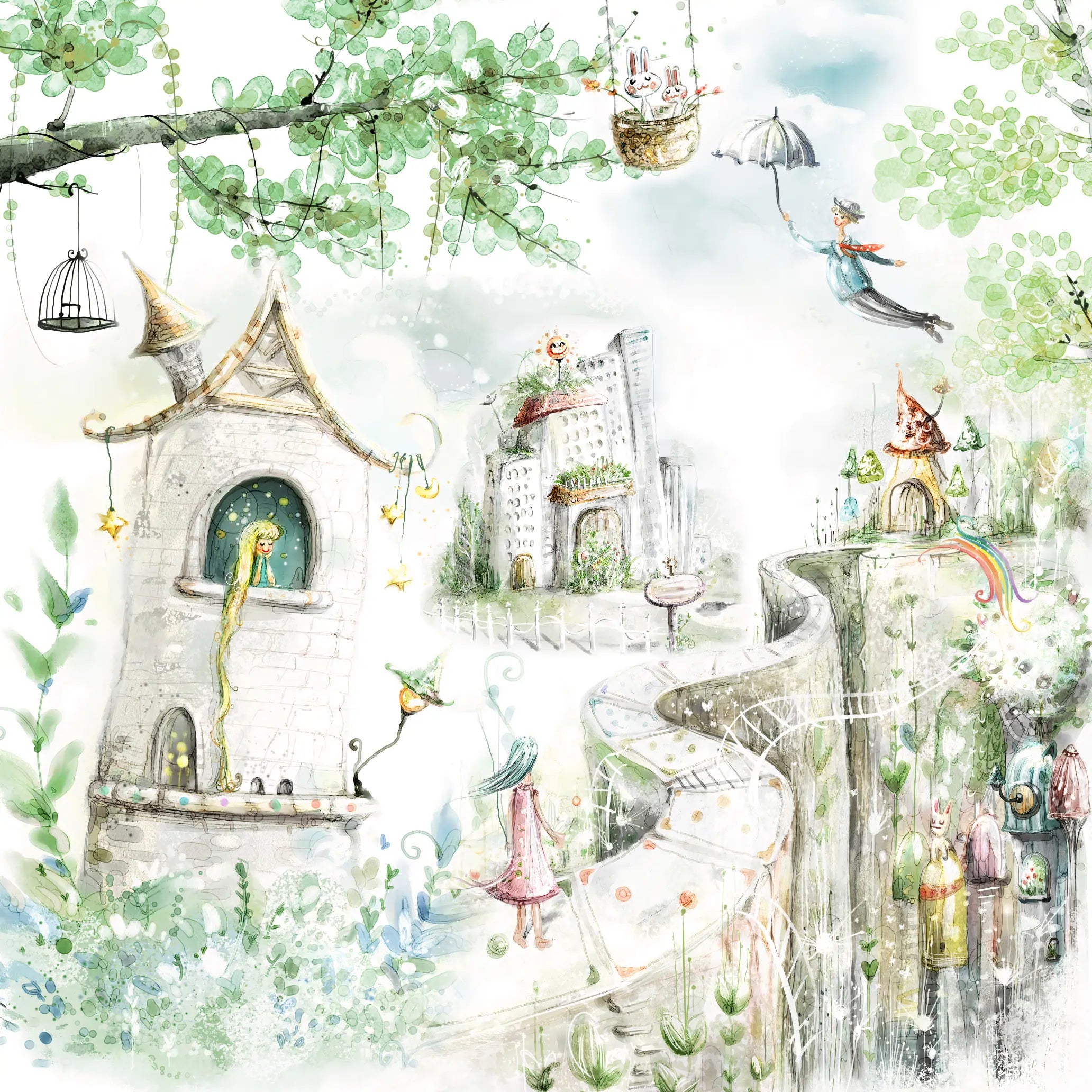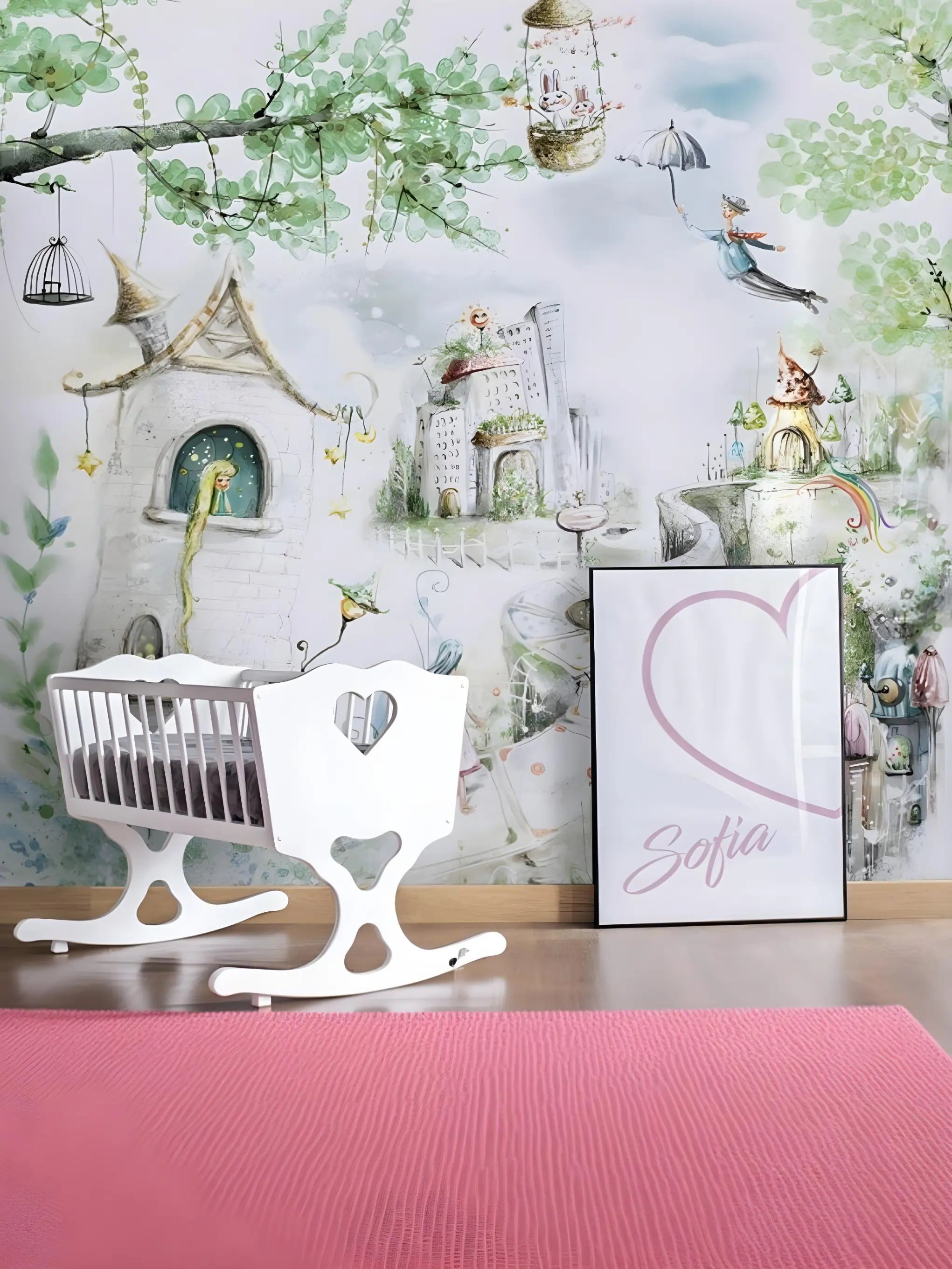 Este mural ilustrado transporta o ambiente para um mundo de fantasia com uma floresta mágica repleta de personagens e cenários encantadores. O estilo artístico suave, com traços delicados e cores pastel, cria uma atmosfera acolhedora e imaginativa, perfeita para quartos infantis ou espaços criativos. A composição estimula a imaginação e oferece uma decoração lúdica e cheia de personalidade.