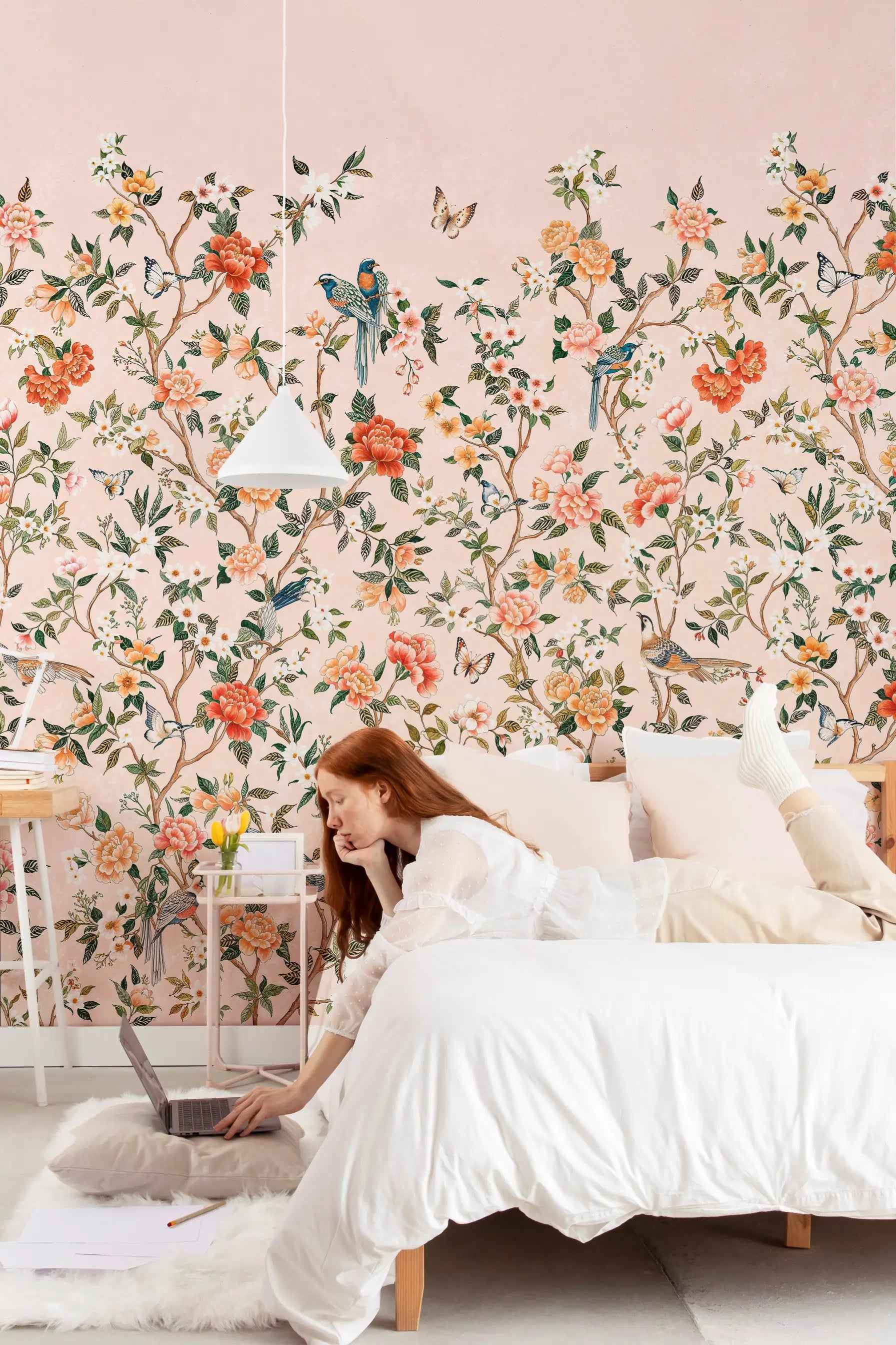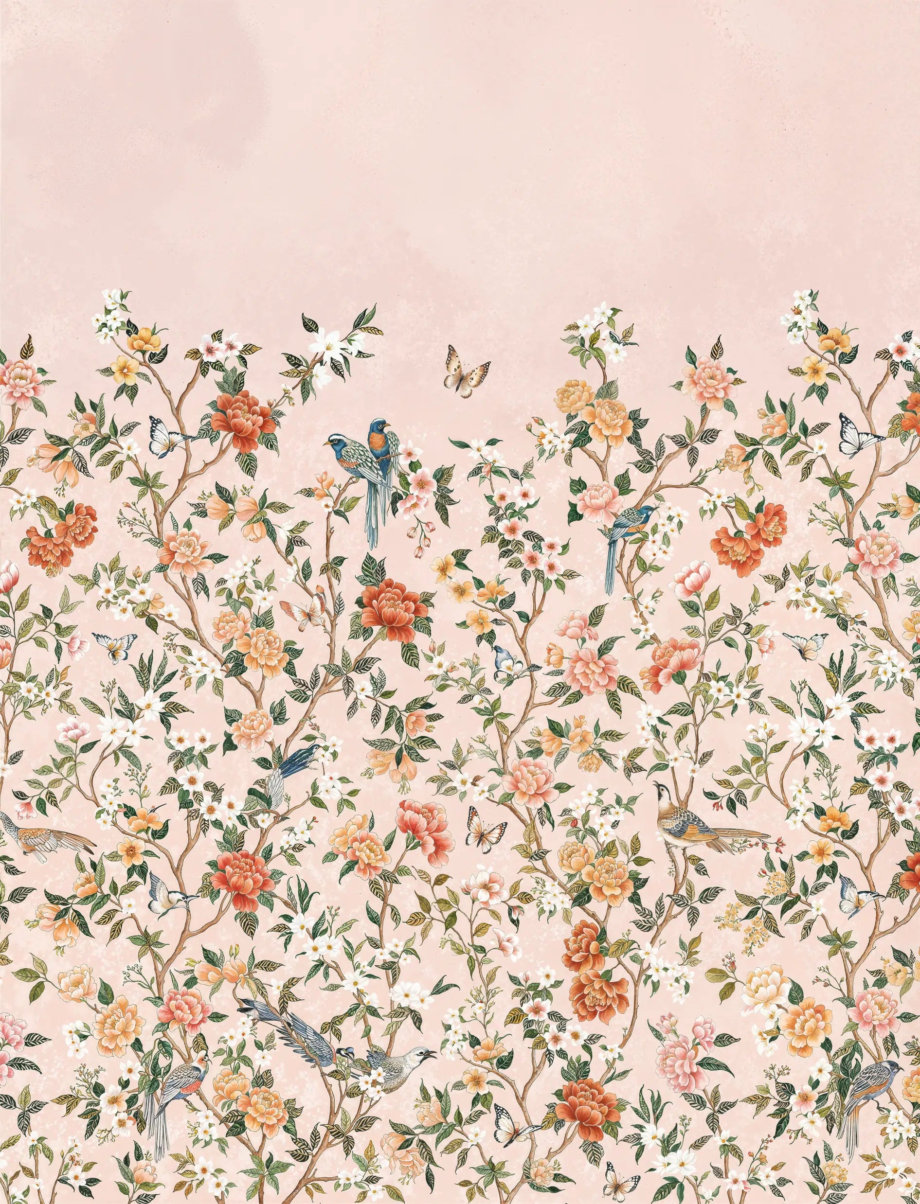 Deixe a elegância atemporal invadir seu lar. Este design, inspirado no estilo Chinoiserie, apresenta uma delicada paisagem com galhos floridos em branco e uma variedade de pássaros coloridos, tudo em um fundo em tom suave de azul-esverdeado. É a escolha perfeita para criar um ambiente sofisticado, sereno e com um toque de arte.