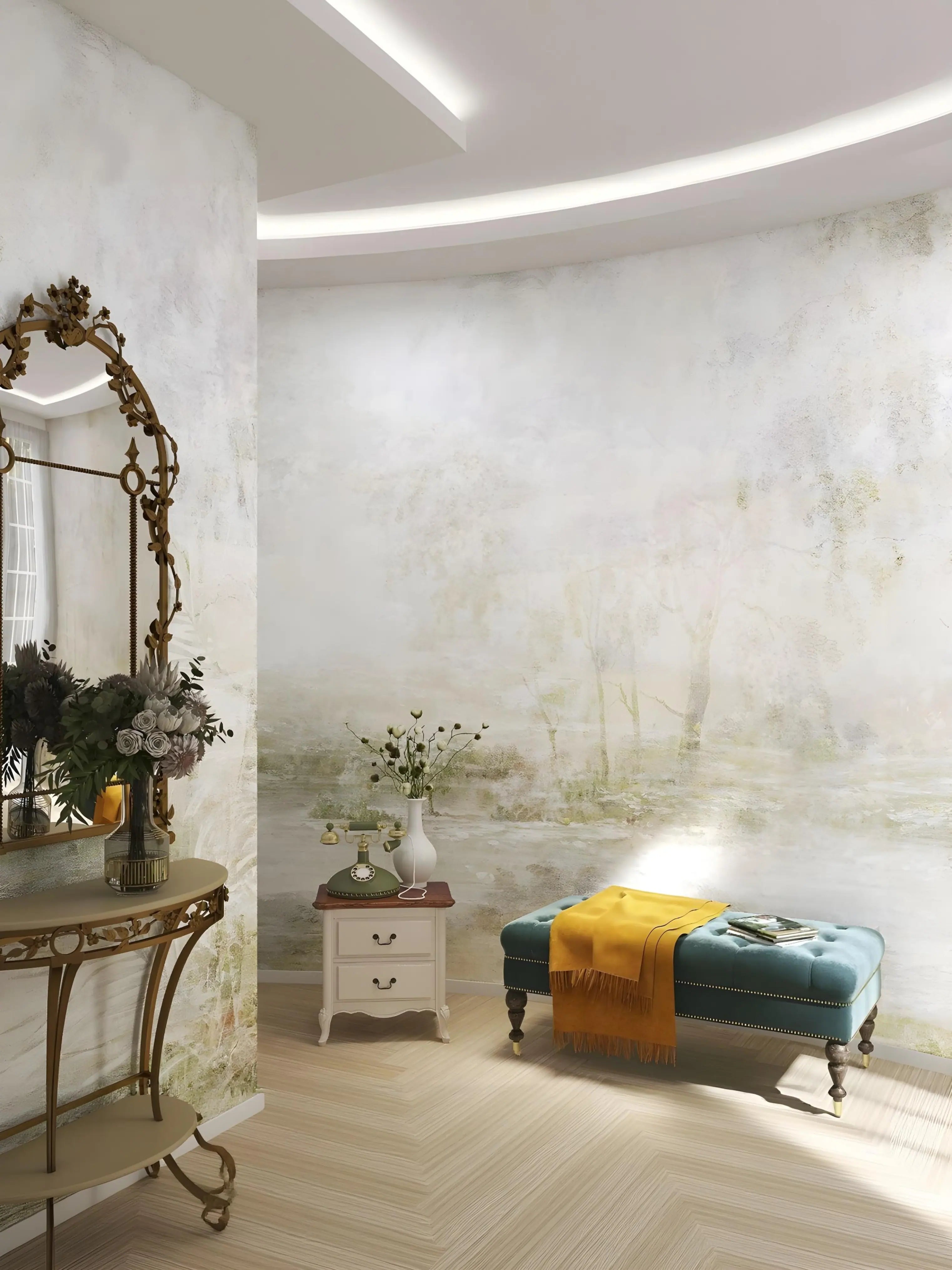Leve a serenidade da natureza para dentro de casa com este papel de parede que simula uma pintura de floresta. Ideal para criar um ambiente acolhedor e artístico, está disponível nas versões autocolante texturizado e tradicional com cola, oferecendo versatilidade na aplicação.