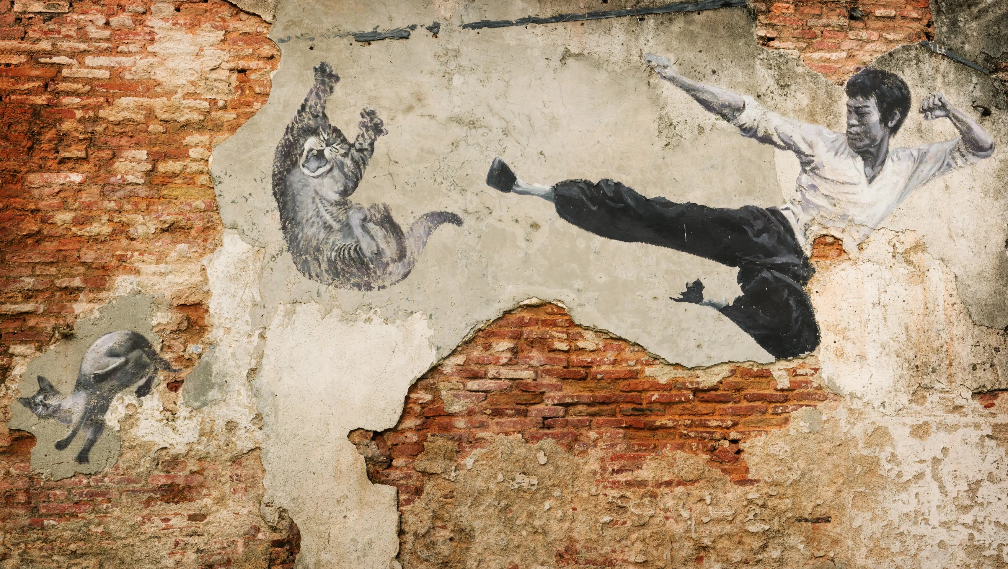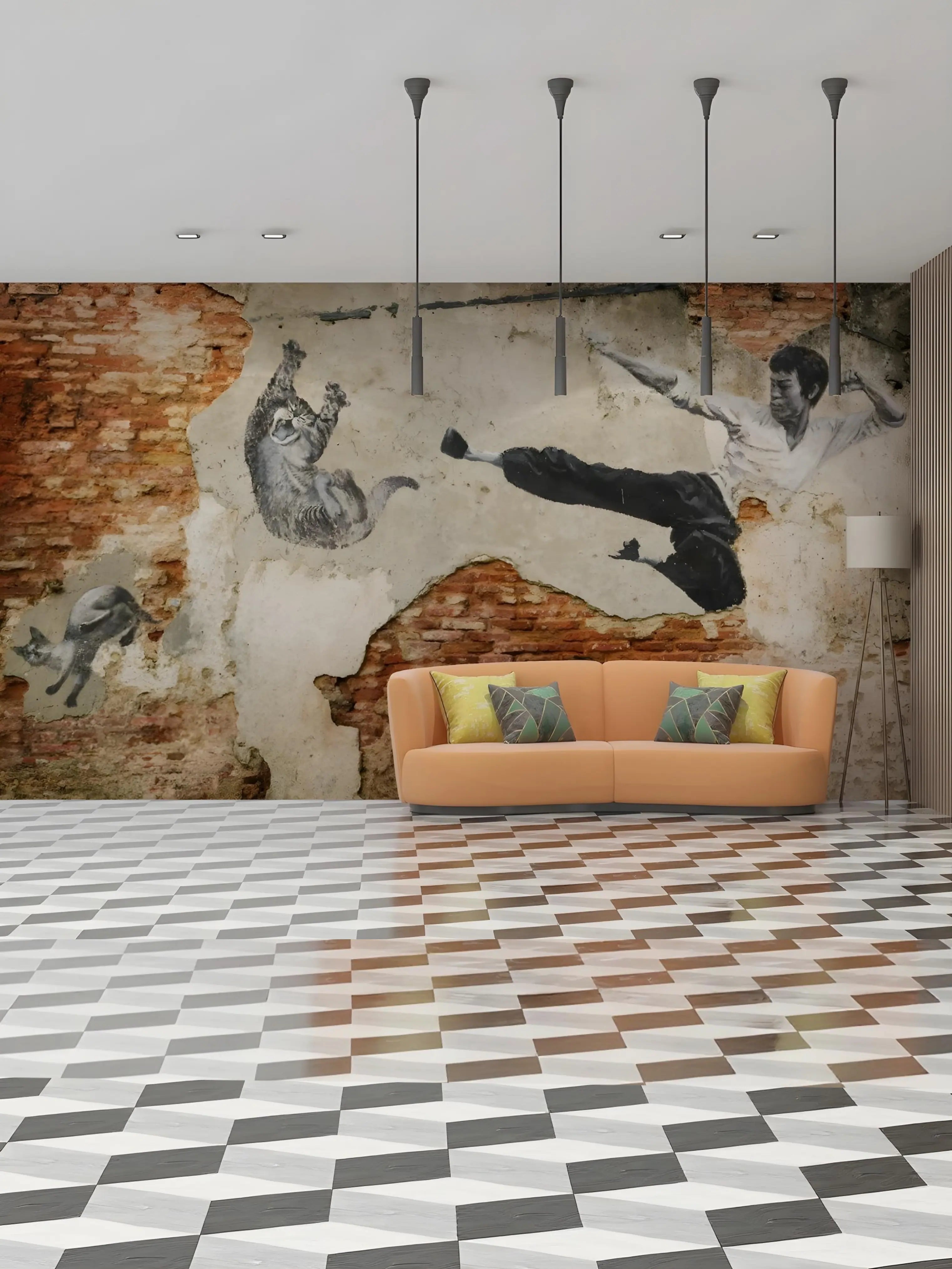 Este papel de parede mistura o visual cru e autêntico do tijolo à vista com uma ilustração estilizada de Bruce Lee, ícone das artes marciais. O fundo rústico, em tom avermelhado de tijolos, dá a base perfeita para a arte urbana, remetendo a um mural de grafite com personalidade e atitude. A imagem de Bruce Lee, com traços marcantes e expressão intensa, cria uma composição ousada, ideal para espaços criativos, studios, áreas de entretenimento ou ambientes com estética industrial. Um verdadeiro manifesto visual de força, cultura pop e estilo urbano.