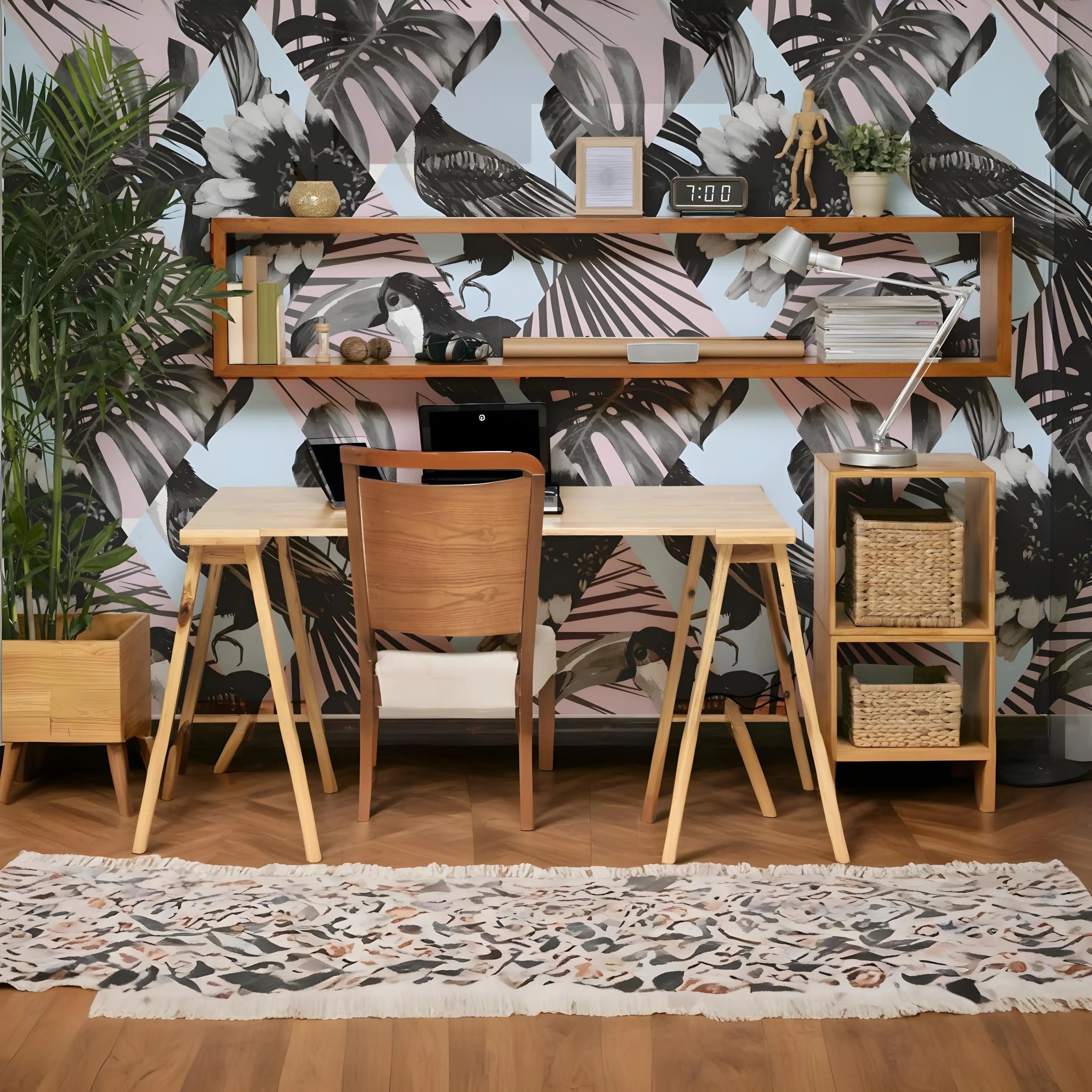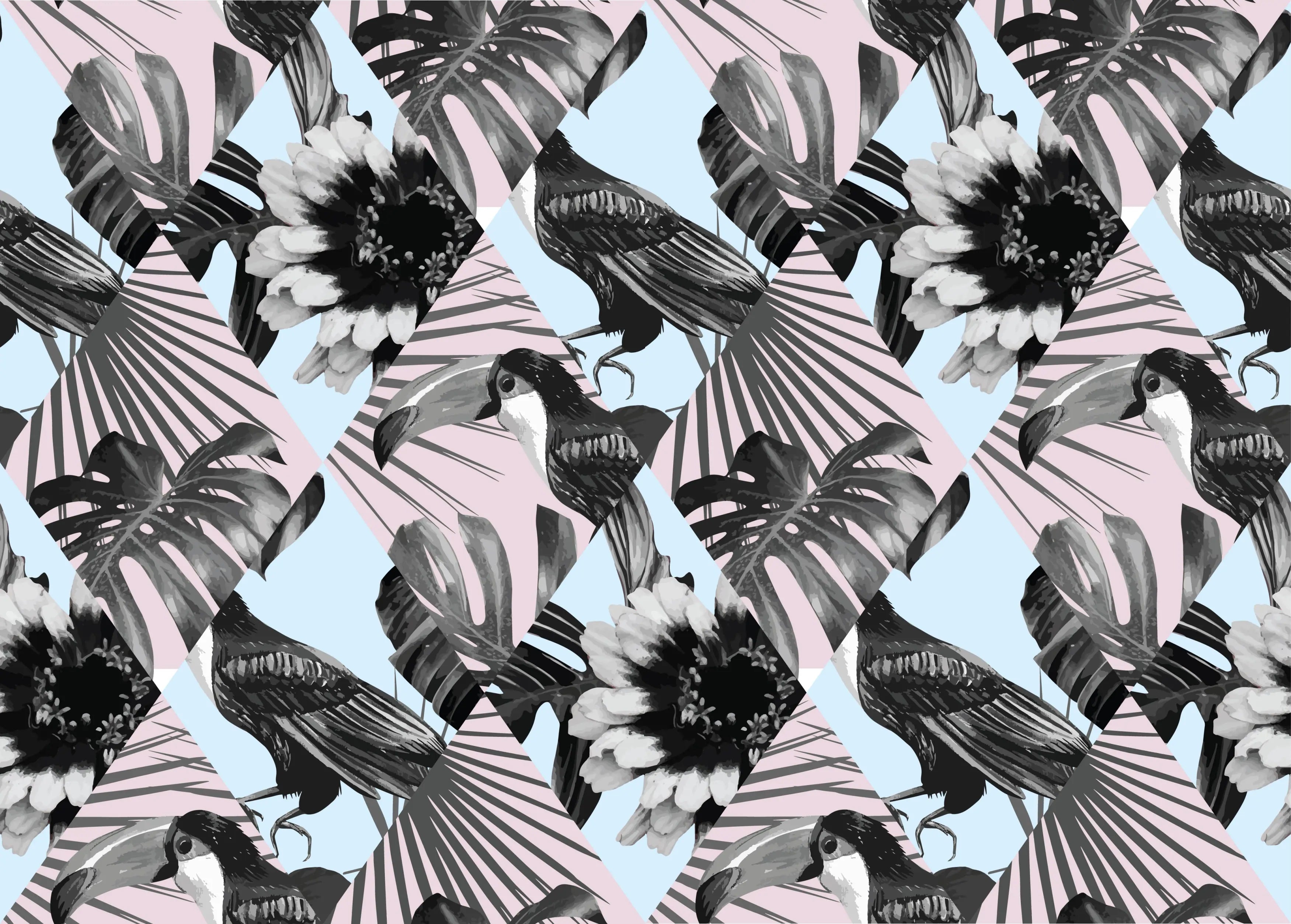 Papel de parede ADcorista com design moderno de patchwork tropical, apresentando elementos como folhas de palmeira, monstera, flores e tucanos sobre um fundo geométrico suave em tons pastel. Elegância tropical com um toque contemporâneo.