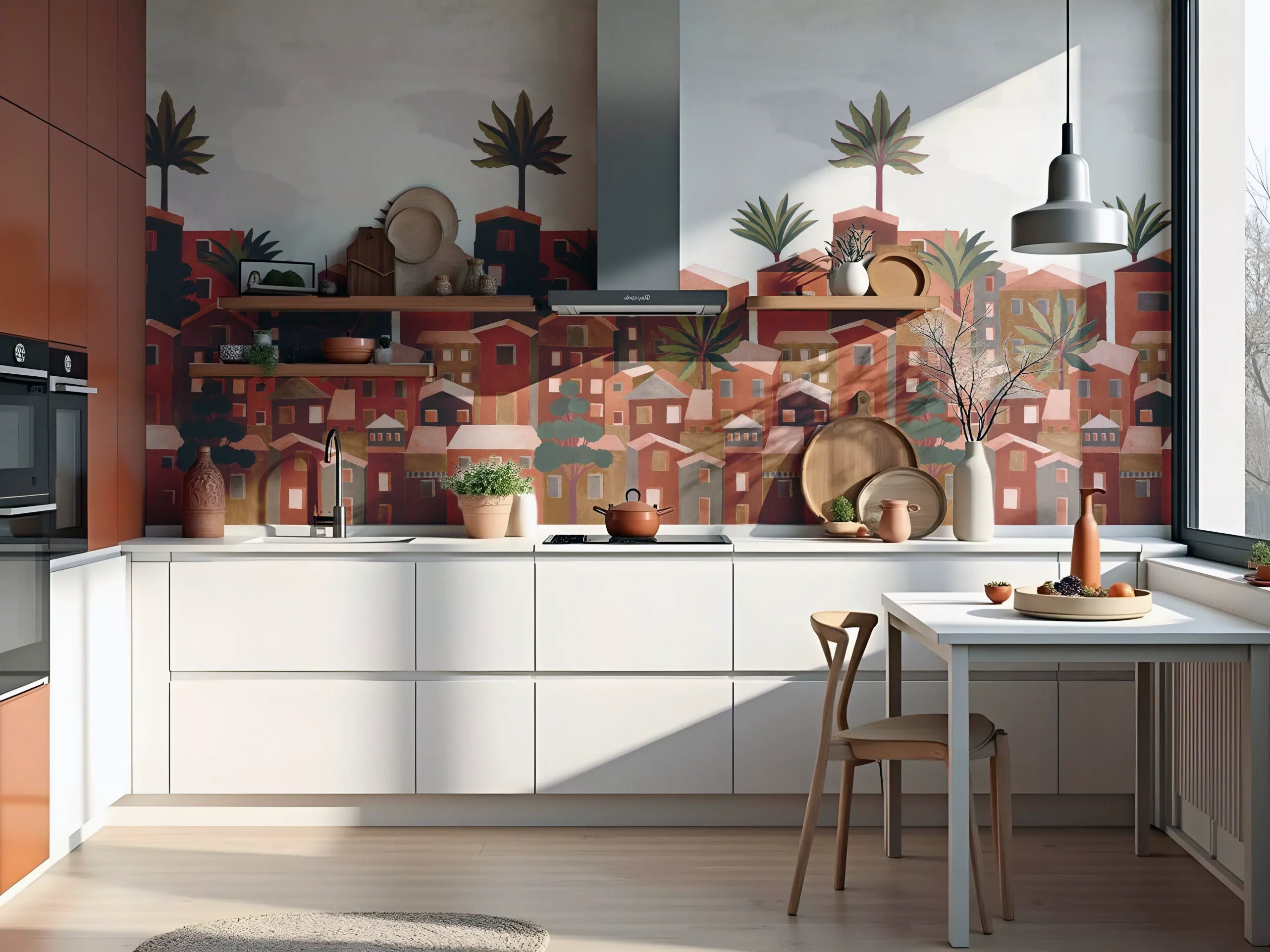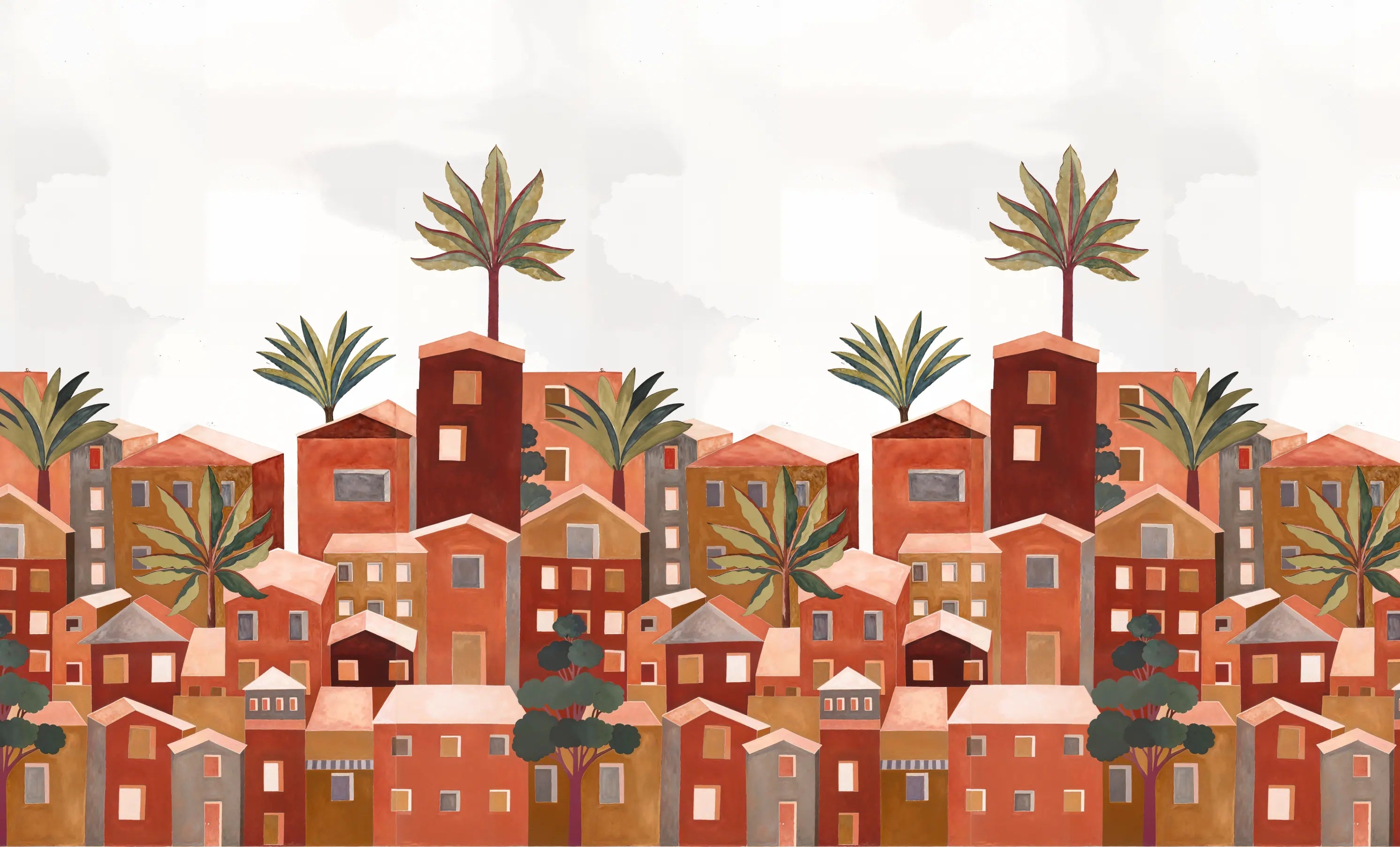 Crie um ambiente acolhedor e com personalidade única com o papel de parede Vila Aconchegante Terracota da ADcorista. Este design encantador ilustra uma vila pitoresca com casas em tons quentes de terracota e marrom, e um toque de verde vibrante vindo de árvores que brotam entre os telhados. Uma estampa que evoca a sensação de um refúgio mediterrâneo ou de uma pequena comunidade charmosa, ideal para adicionar calor e um toque artístico a qualquer espaço.